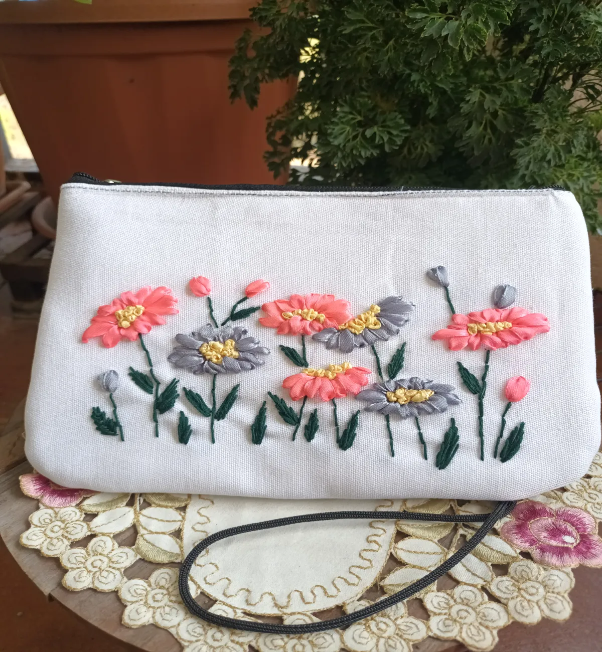 This mini sling purse with ribbon embroidered flowers is ideal for your casual wear. It has a long black sling for easy carrying across the body. It is big enough to accommodate your mobile and other personal belongings. It also has a zipper inside for your keys or loose change.