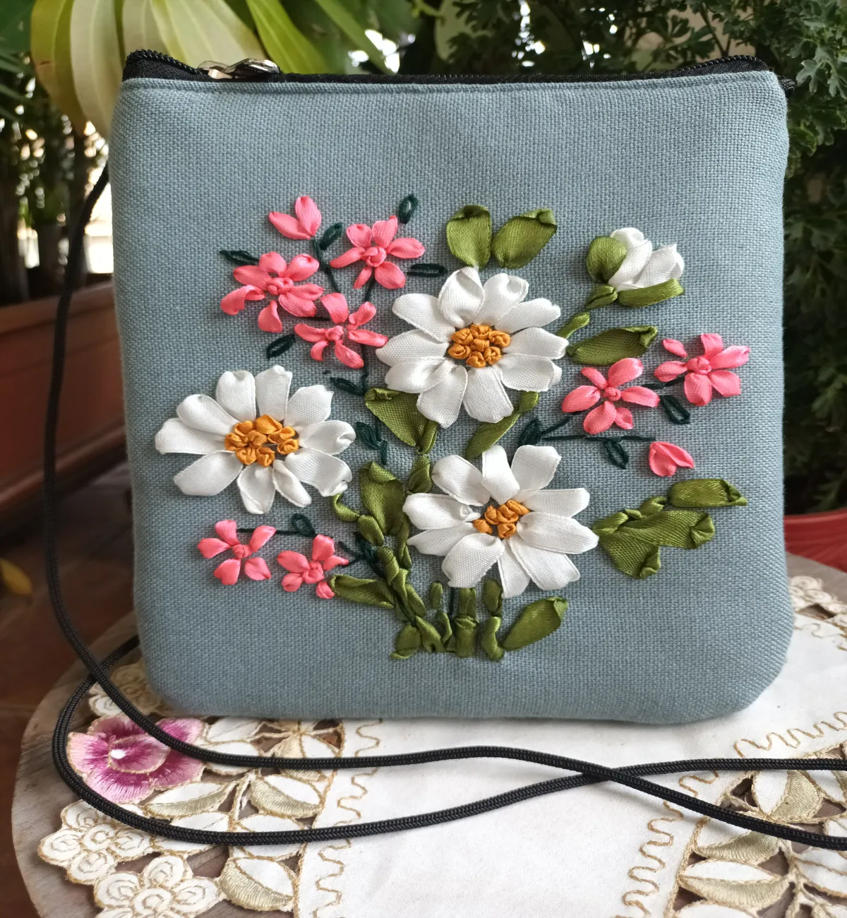 This mini sling purse with ribbon embroidered flowers is ideal for your casual wear. It has a long black sling for easy carrying across the body. It is big enough to accommodate your mobile and other personal belongings. It also has a zipper inside for your keys or loose change.