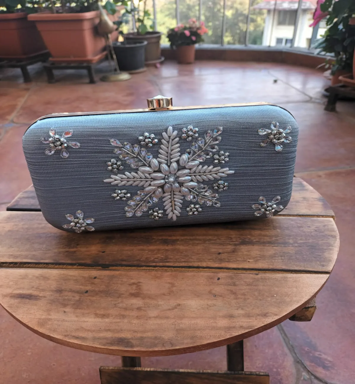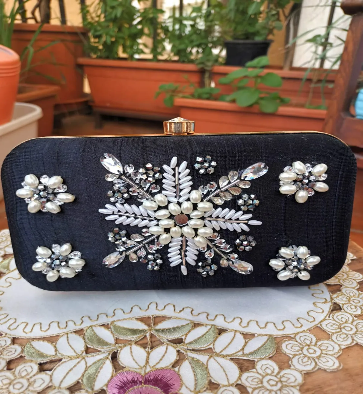 The combination of pearl and rhinestone hand embroidery gives this elegant clutch a delicate and sophisticated feel, with neutral colors making it versatile enough to complement various outfits, whether for a wedding, formal dinner, or special event, while the silver chain adds practicality and style, and its capacity to accommodate a mobile phone ensures both functionality and beauty.