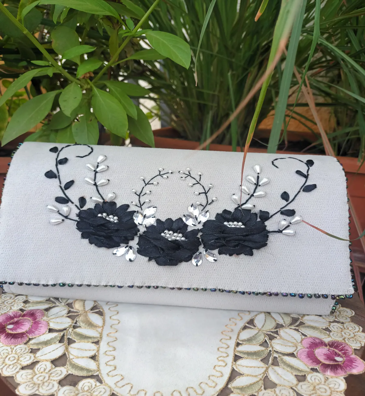 Crafted from velvet with a satin inner lining, this beautiful and elegant clutch pairs well with many outfits, offering a classy contrast between the light base and dark floral details. The silver chain adds an elegant touch while making it convenient to carry. Since the clutch is hand-embroidered, it showcases exceptional craftsmanship and attention to detail. Each piece is unique, as handwork often includes slight variations that give it a personal touch.
