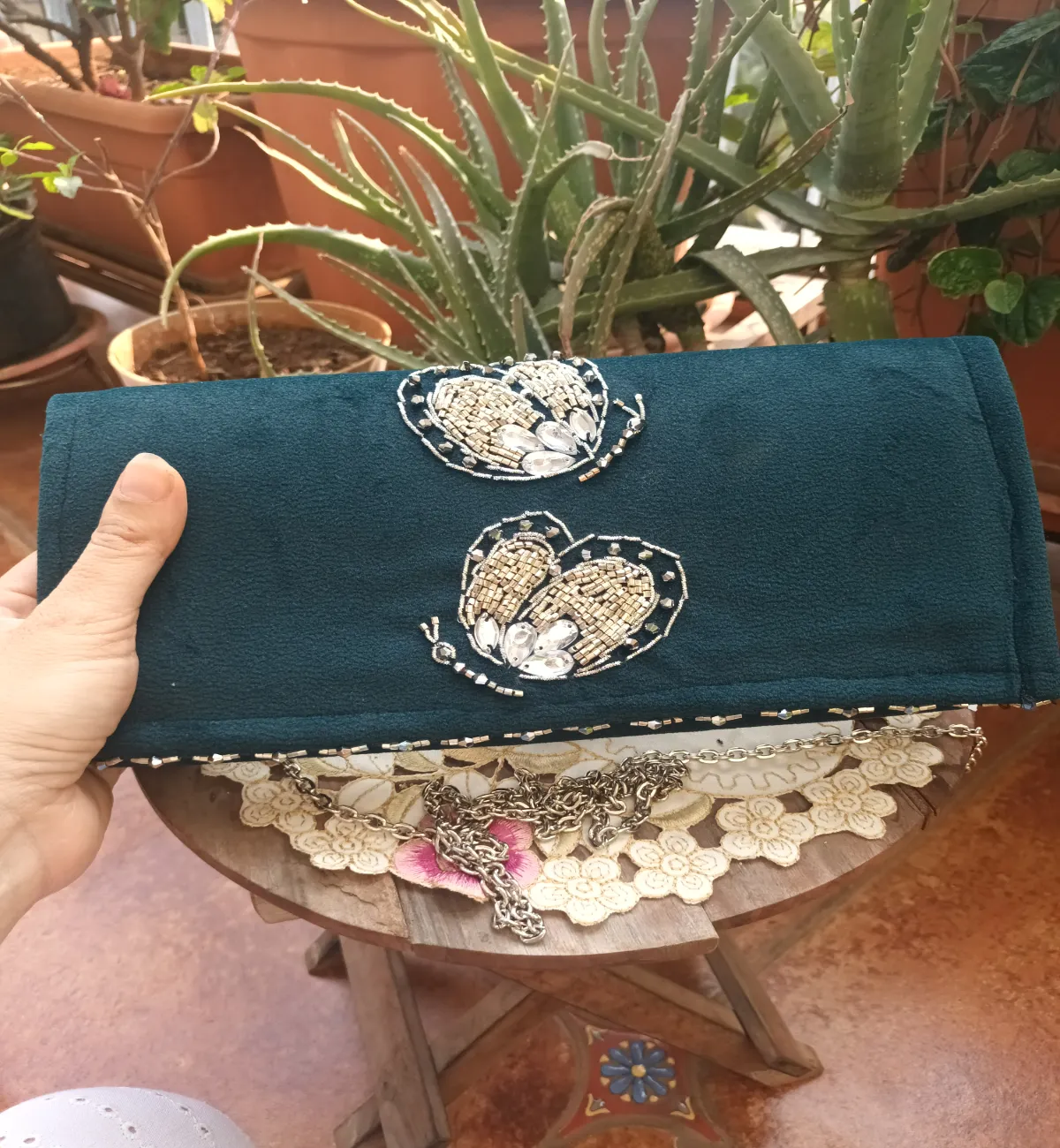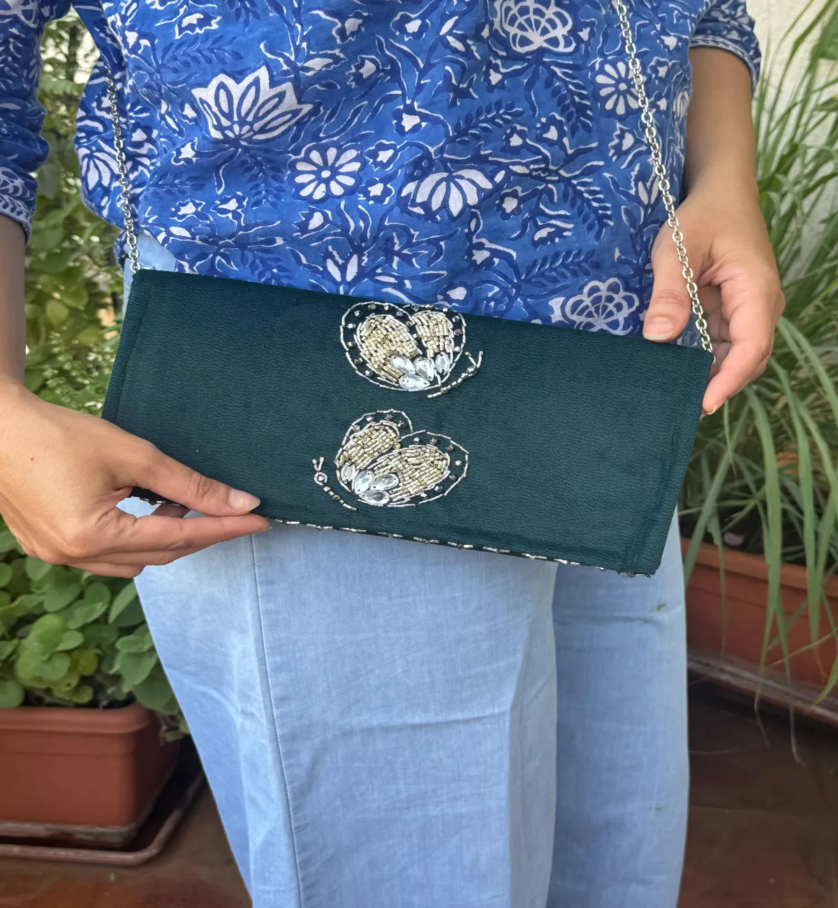This dark green velvet clutch features intricate silver bead embroidery of butterflies, adding an elegant and whimsical touch. Each butterfly is meticulously hand-embroidered, creating a design that sparkles with depth and artistry. The clutch is both stylish and practical, with a silver chain that allows for easy carrying while maintaining a sophisticated look. Since each piece is handcrafted, slight variations make every clutch truly unique and one-of-a-kind, reflecting a high level of craftsmanship and attention to detail.