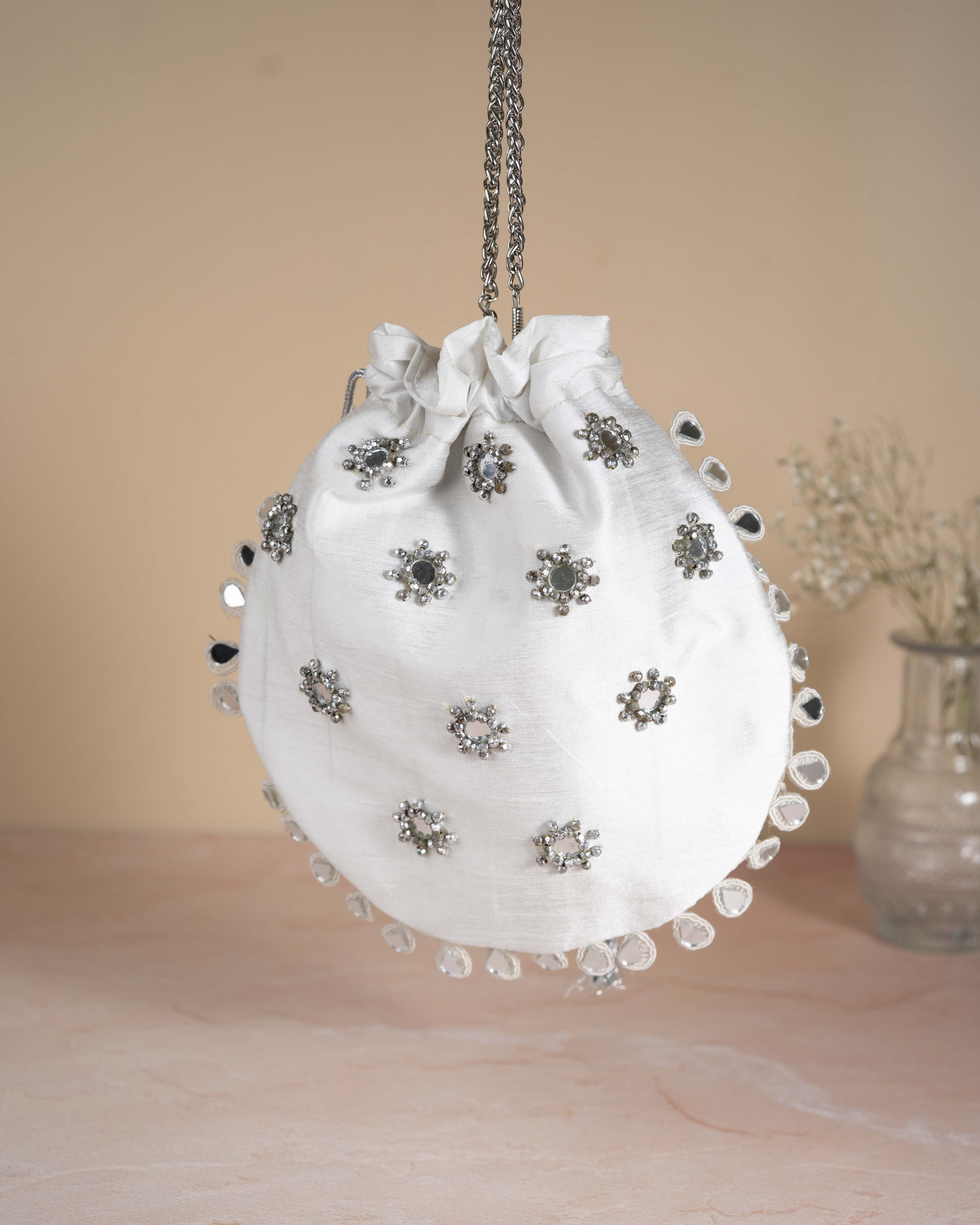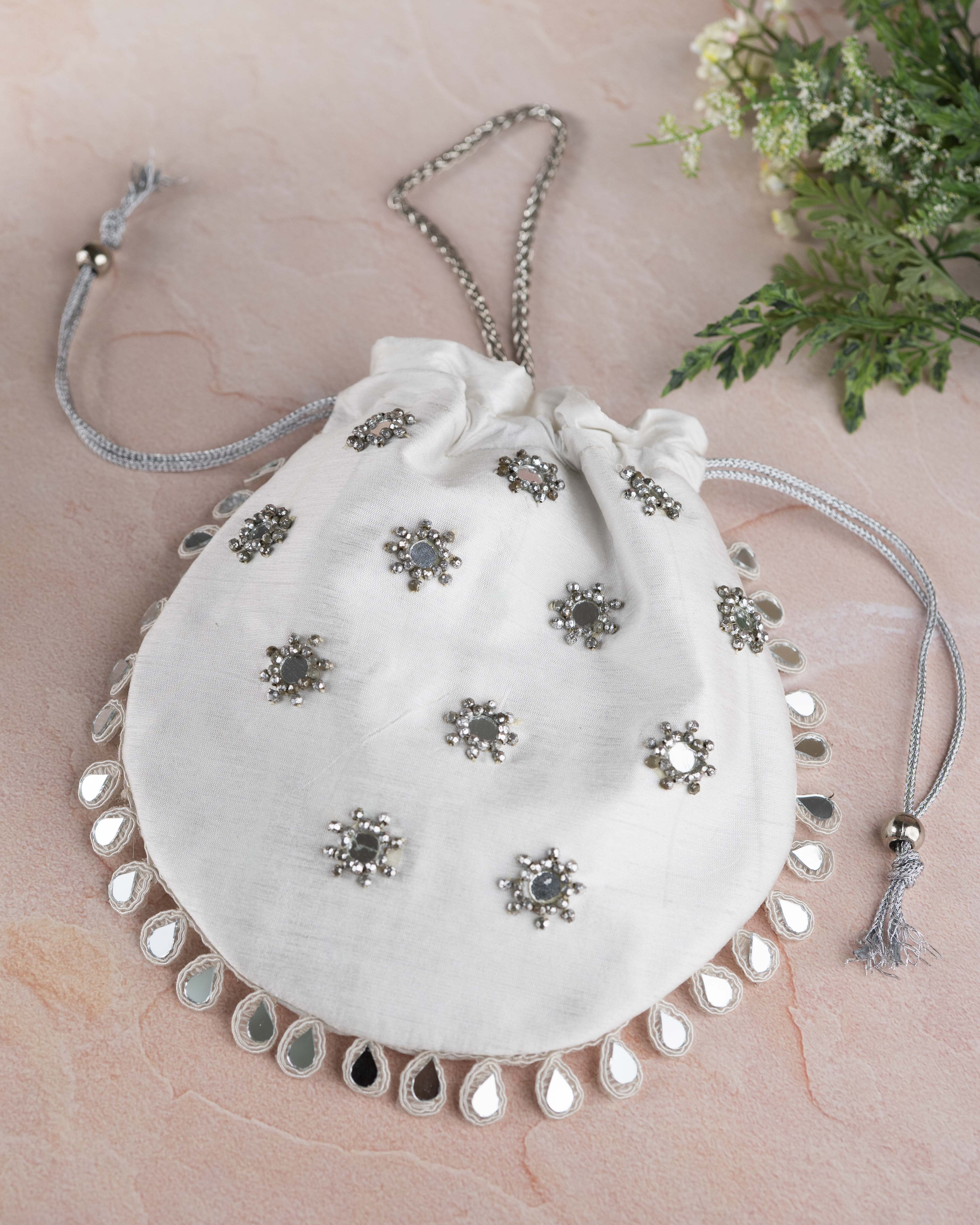 The sparkle of beads and the reflective mirror lace gives this potli a chic , modern feel while maintaining traditional elegance.This kind of potli would be a versatile accessory for a variety of occasions , from weddings to festive parties, where you want to add a touch of glam.