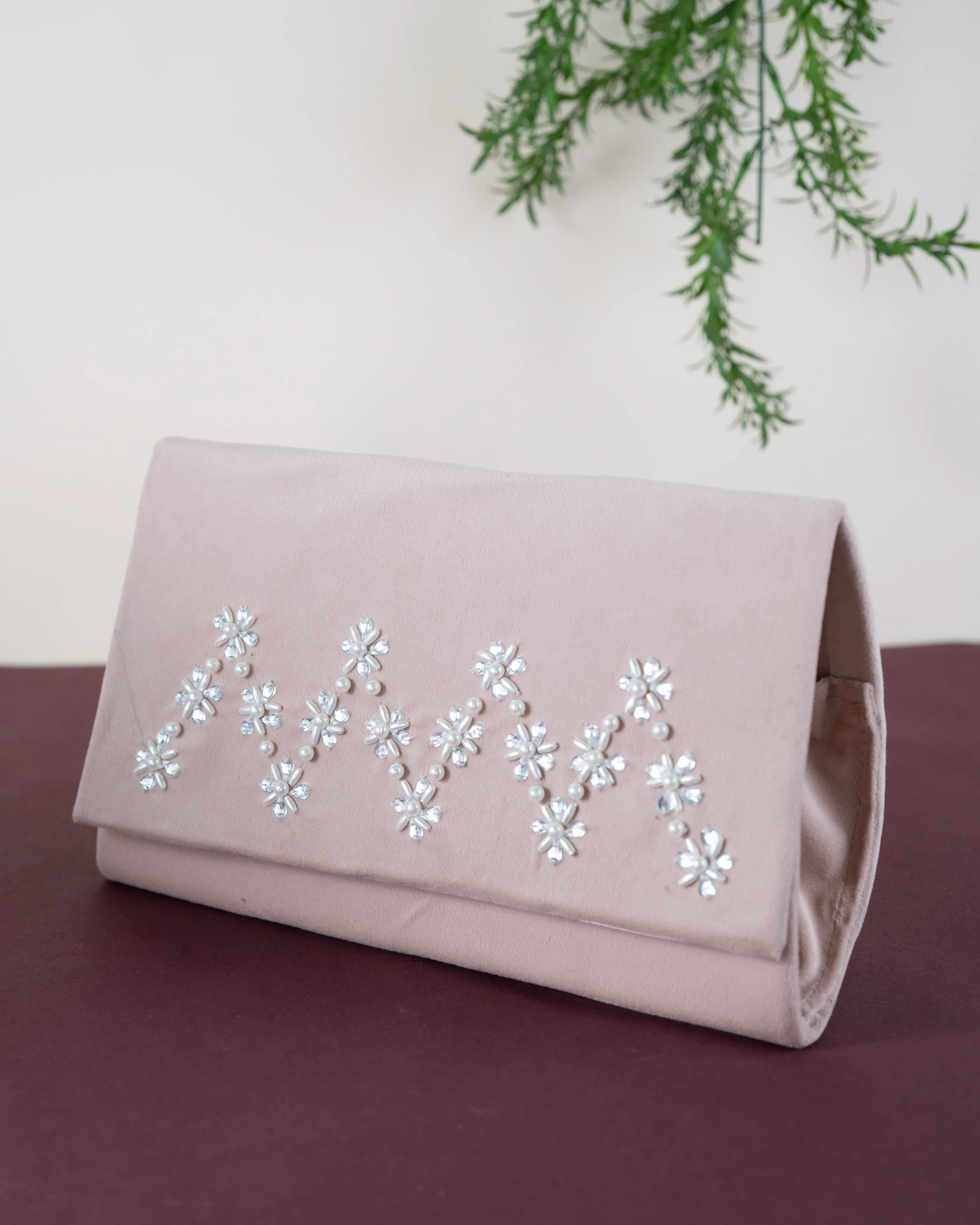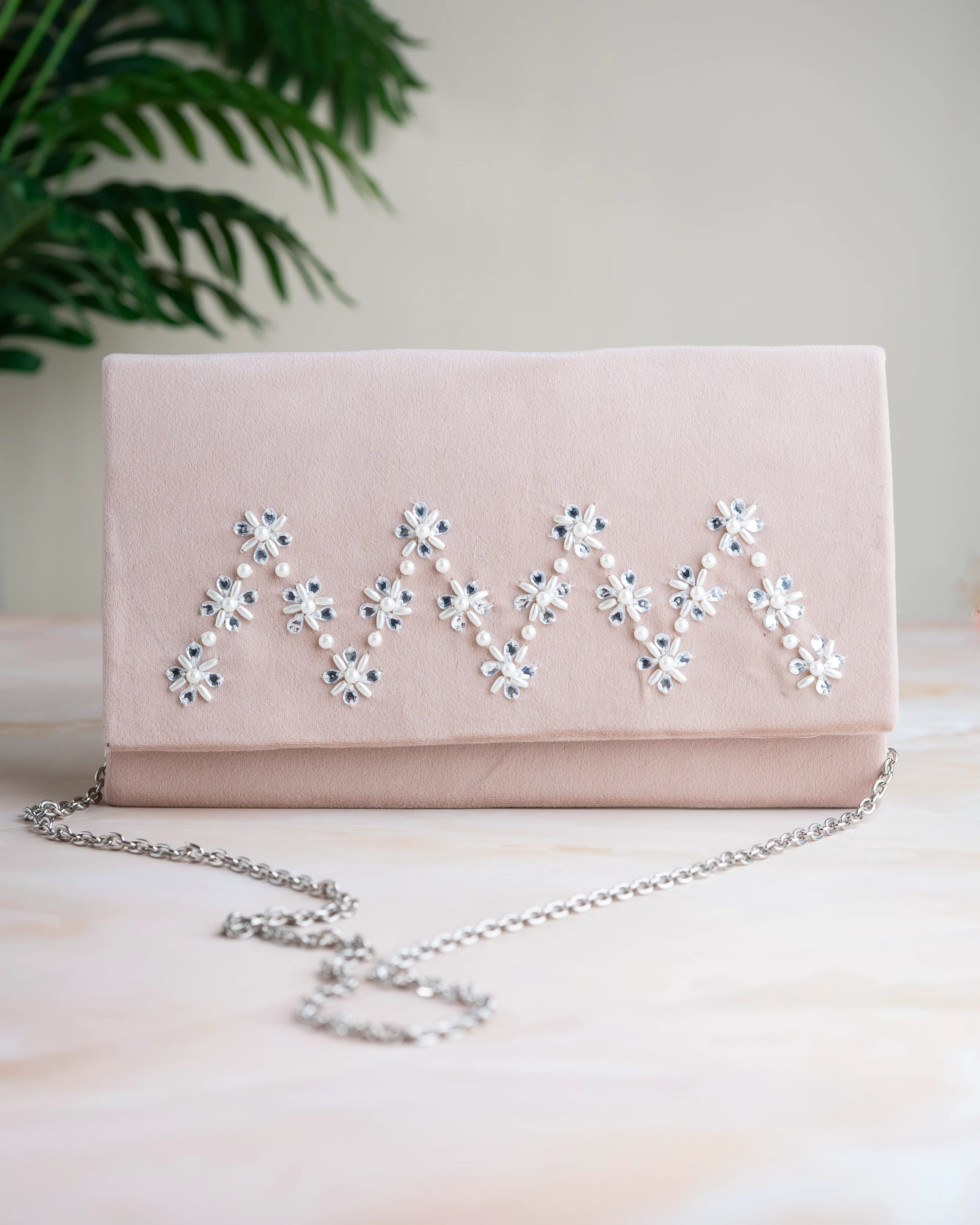 Crafted from velvet with a satin inner lining, this beautiful and elegant clutch pairs well with many outfits. The silver chain adds an elegant touch while making it convenient to carry. Since the clutch is hand-embroidered, it showcases exceptional craftsmanship and attention to detail. Each piece is unique, as handwork often includes slight variations that give it a personal touch.