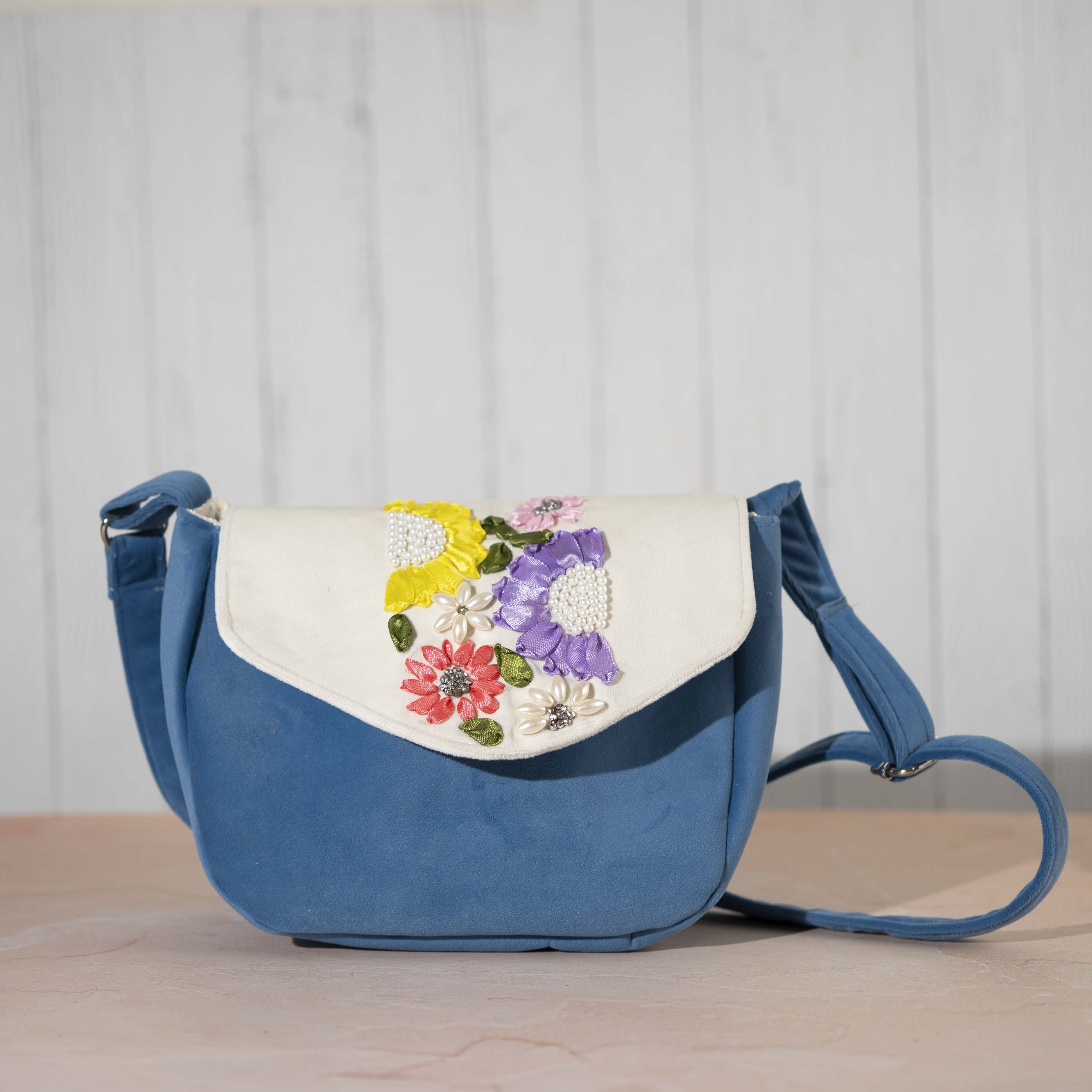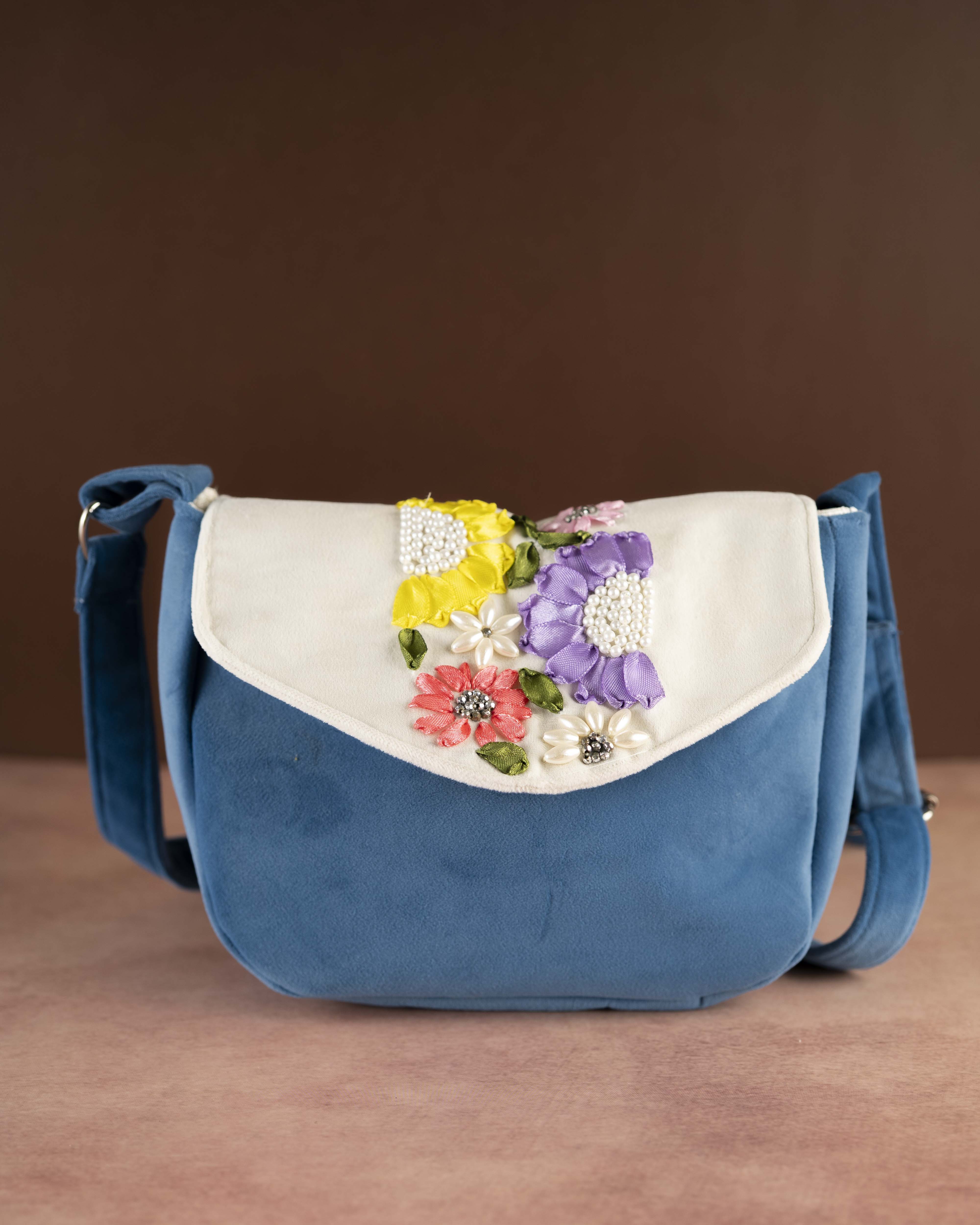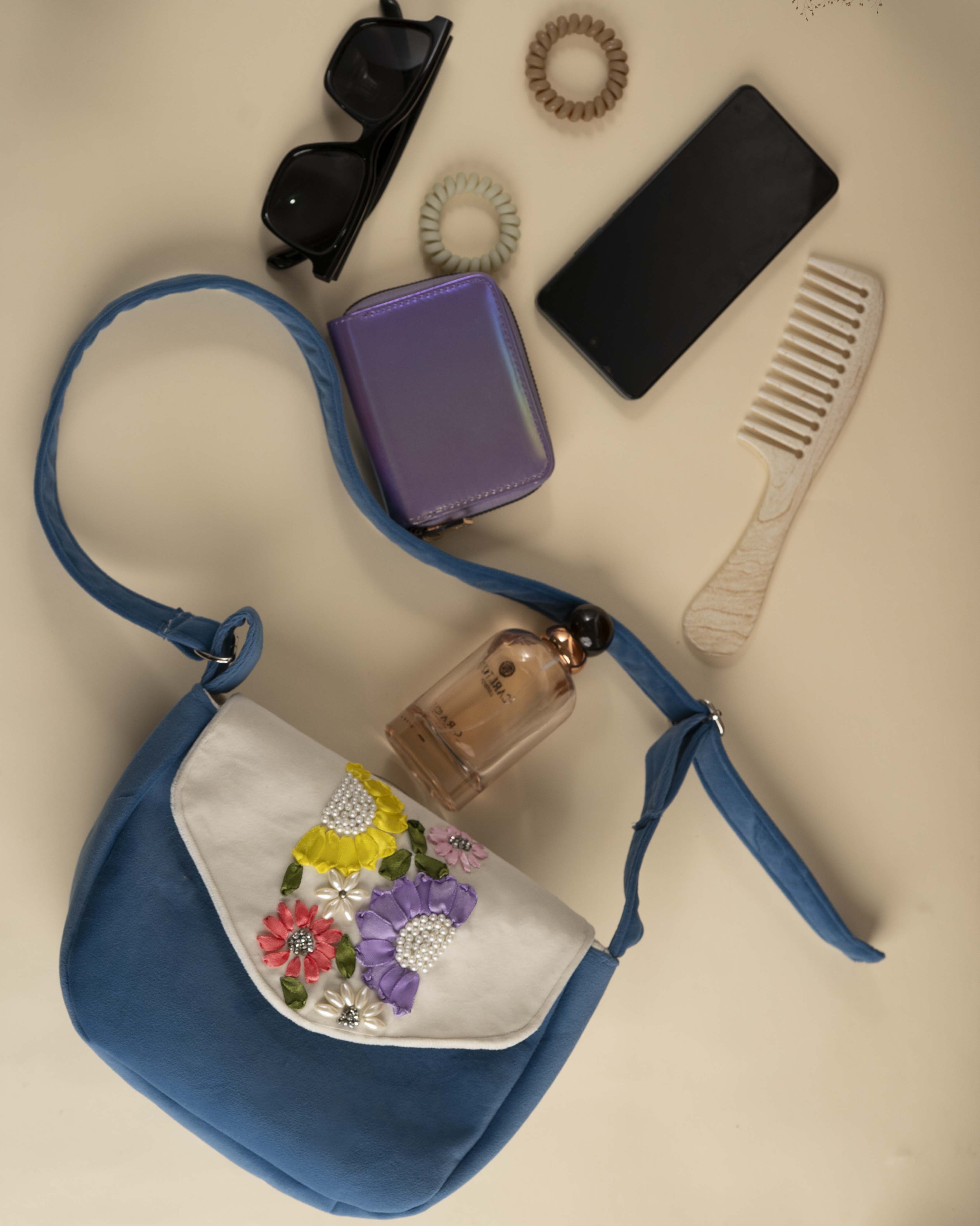 Elevate your look with this fashionable blue purse, featuring a delicatel ribbon and bead embroidery on the flap. Designed with both style and function in mind, it includes a secure interior zipper compartment and a comfortable shoulder strap for effortless carrying. Perfectly chic for both day and night outings.