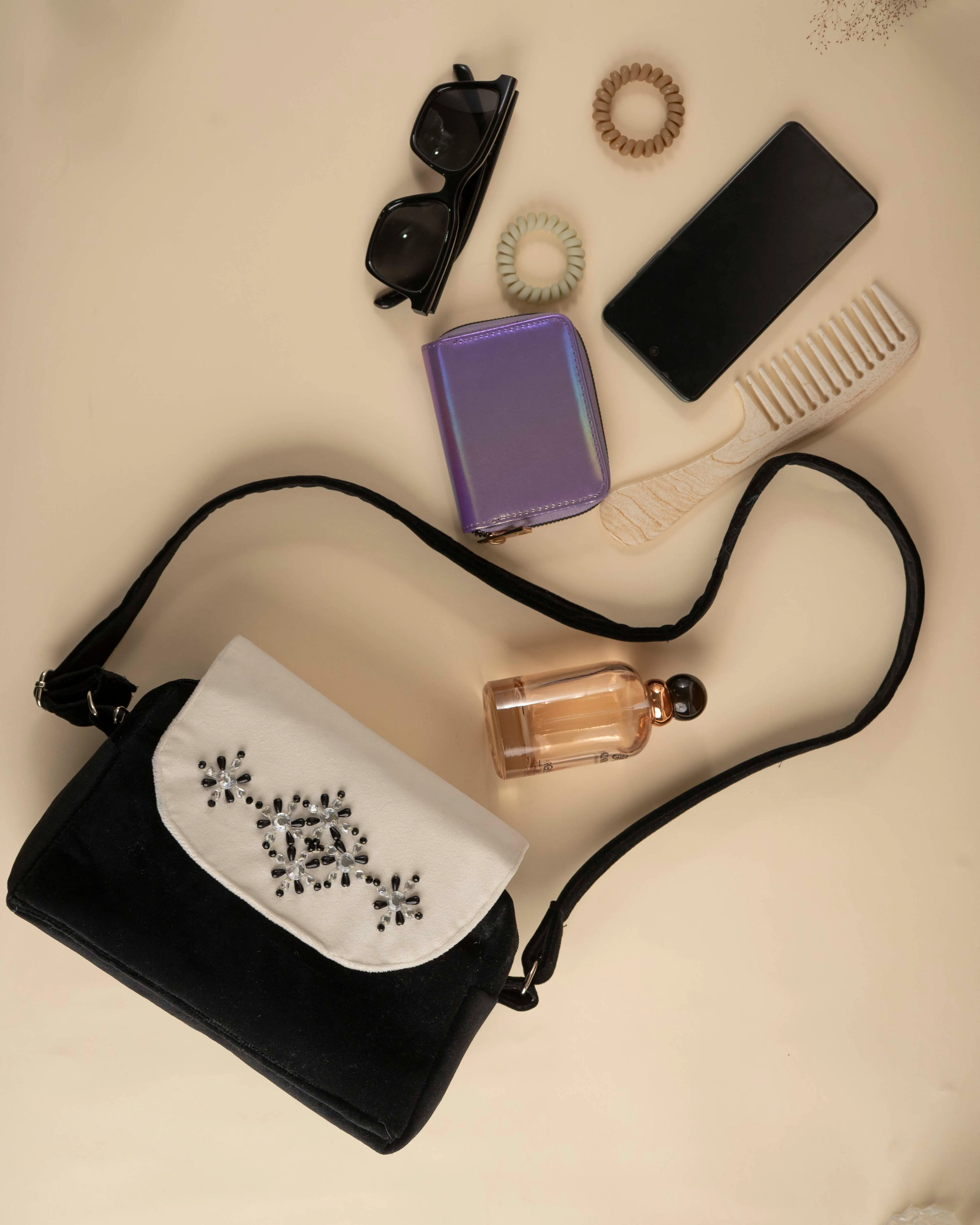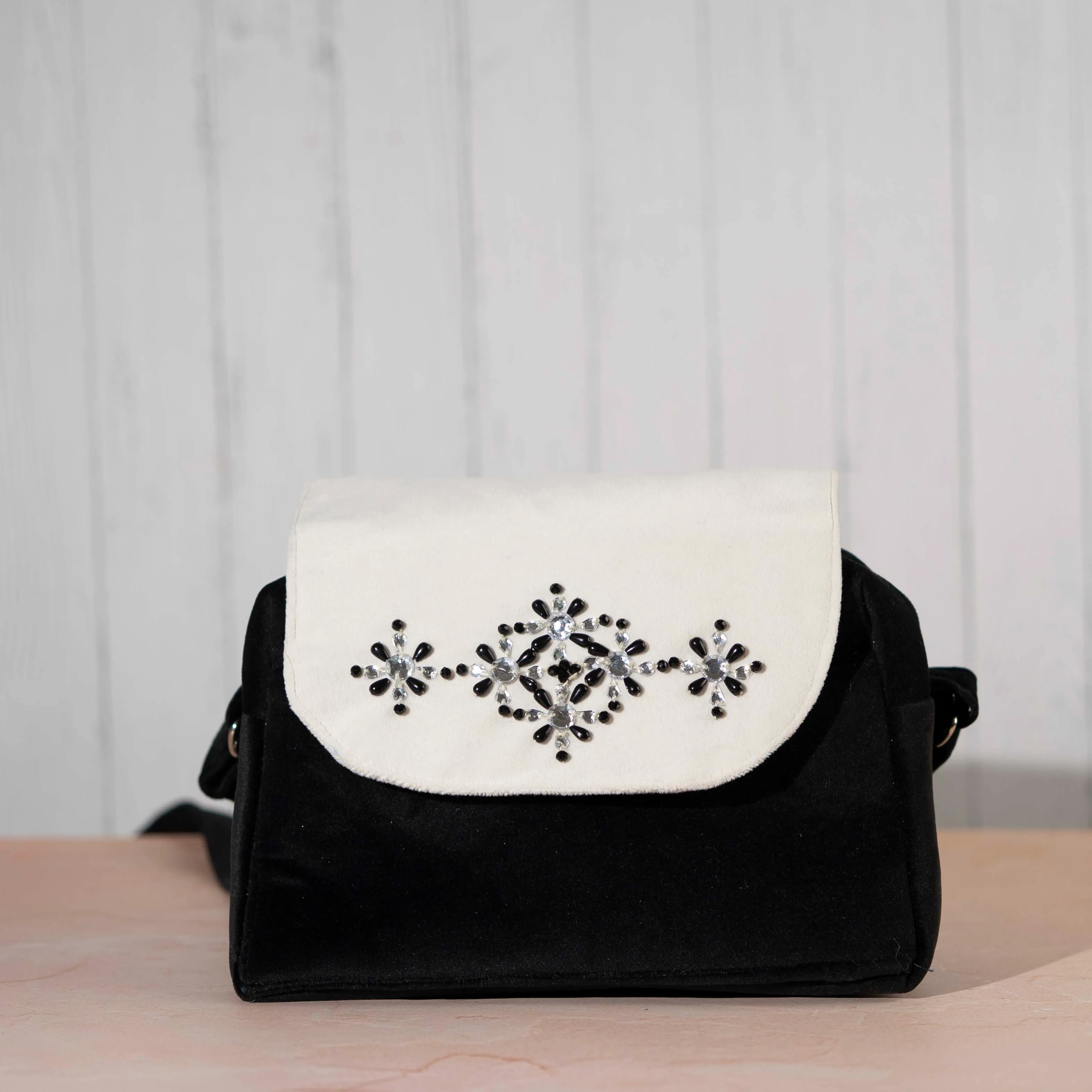 Elevate your look with this fashionable black and white purse, featuring delicate bead embroidery on the flap. Designed with both style and function in mind, it includes a secure interior zipper compartment and a comfortable shoulder strap for effortless carrying. Perfectly chic for both day and night outings.