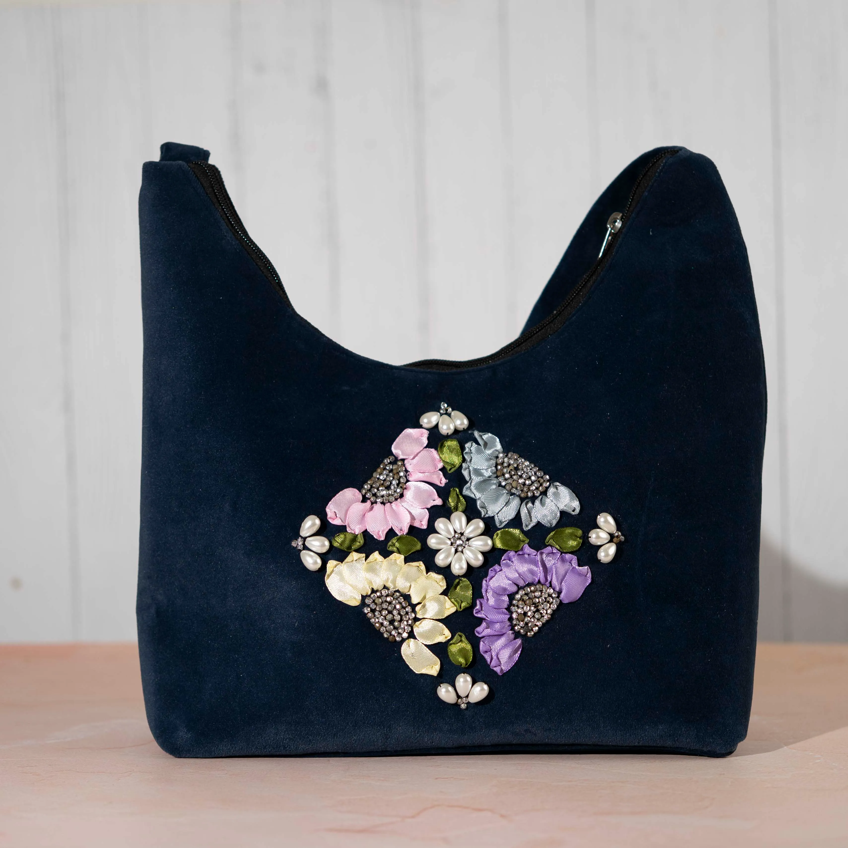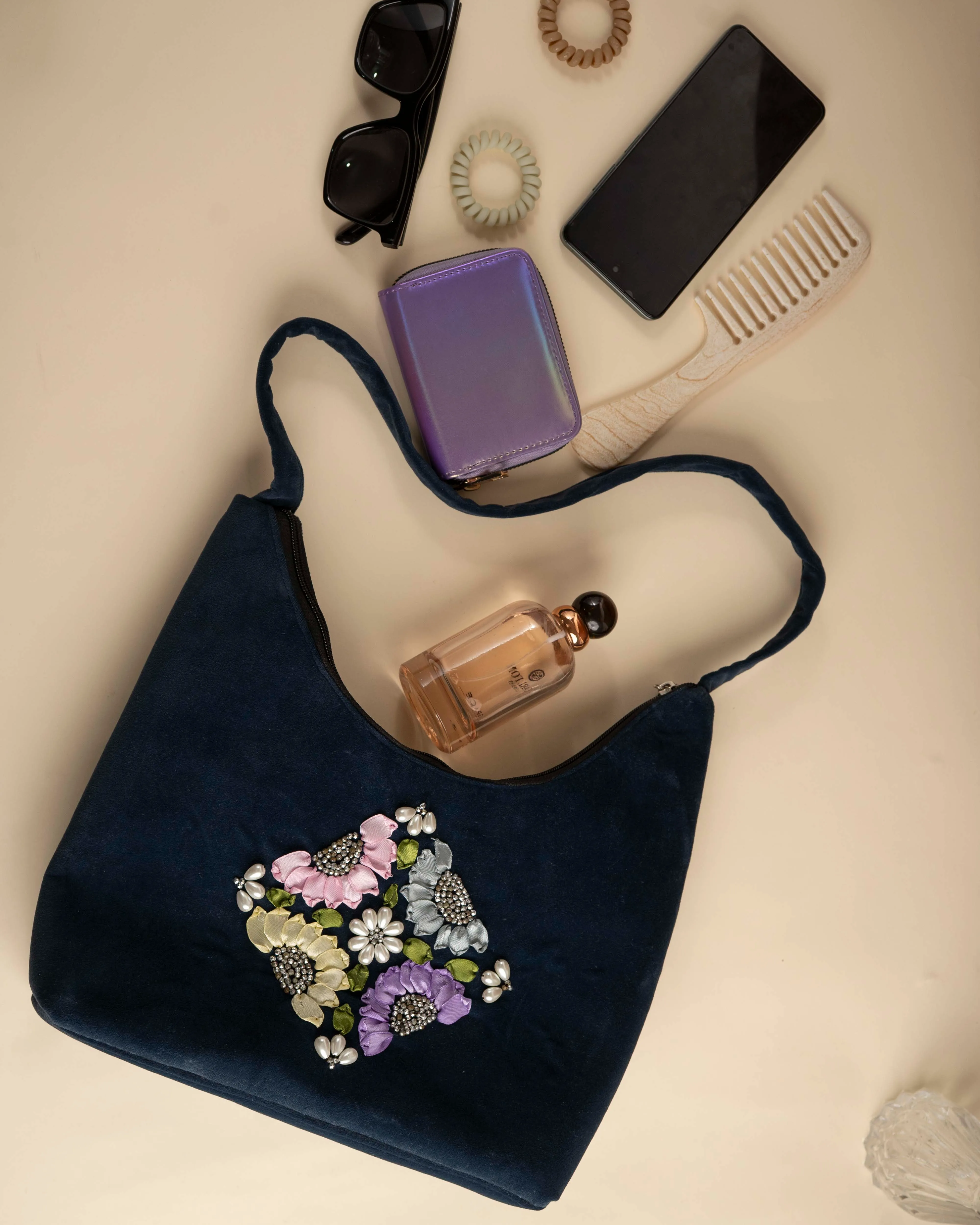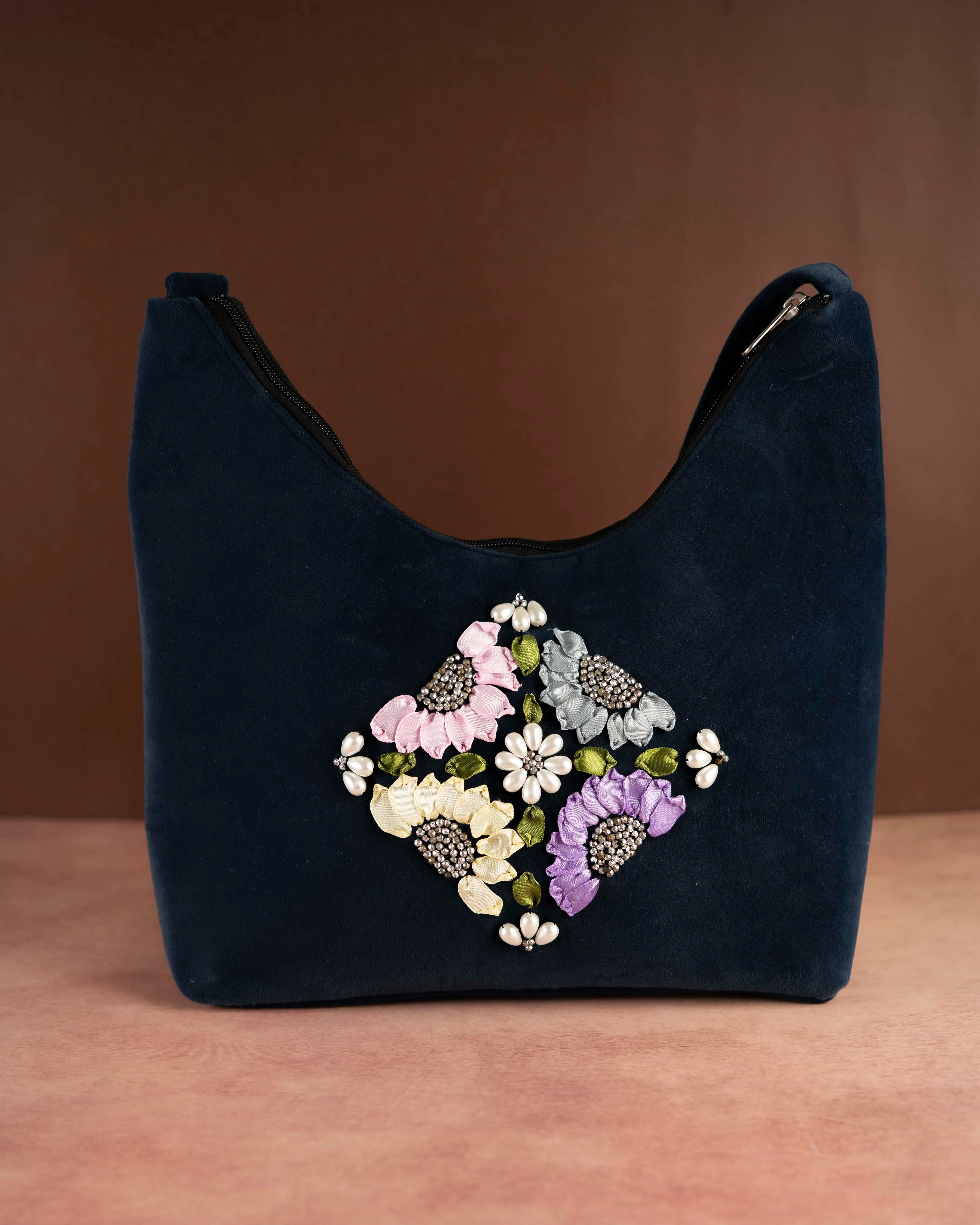 Elevate your everyday style with this beautifully handcrafted blue shoulder bag, featuring ribbon flowers and pearl bead embroidery.Designed for both elegance and practicality, this spacious bag easily holds your daily essentials.