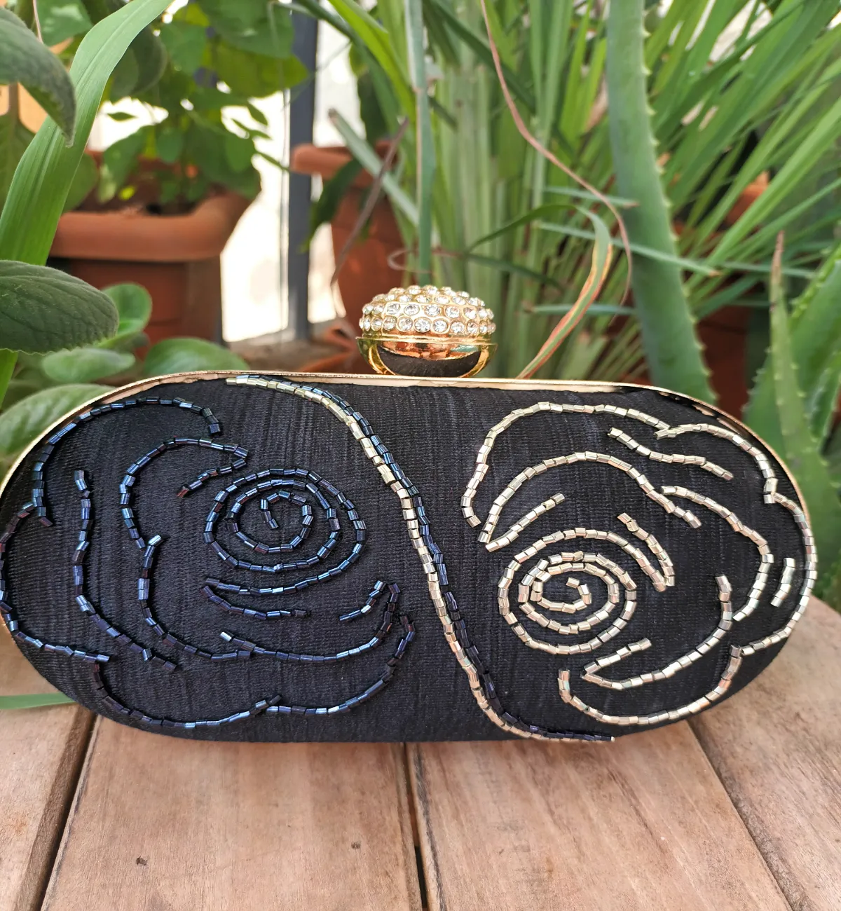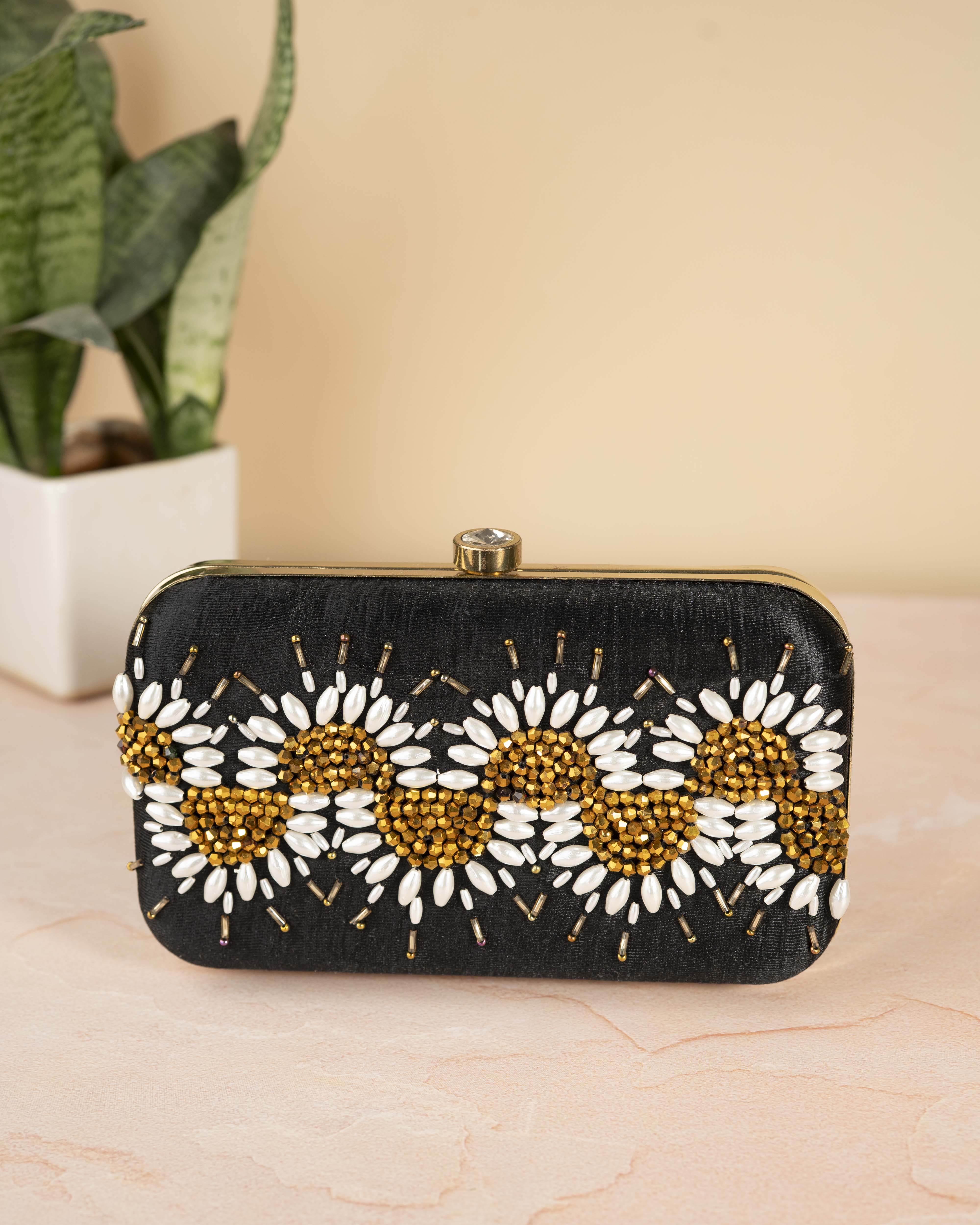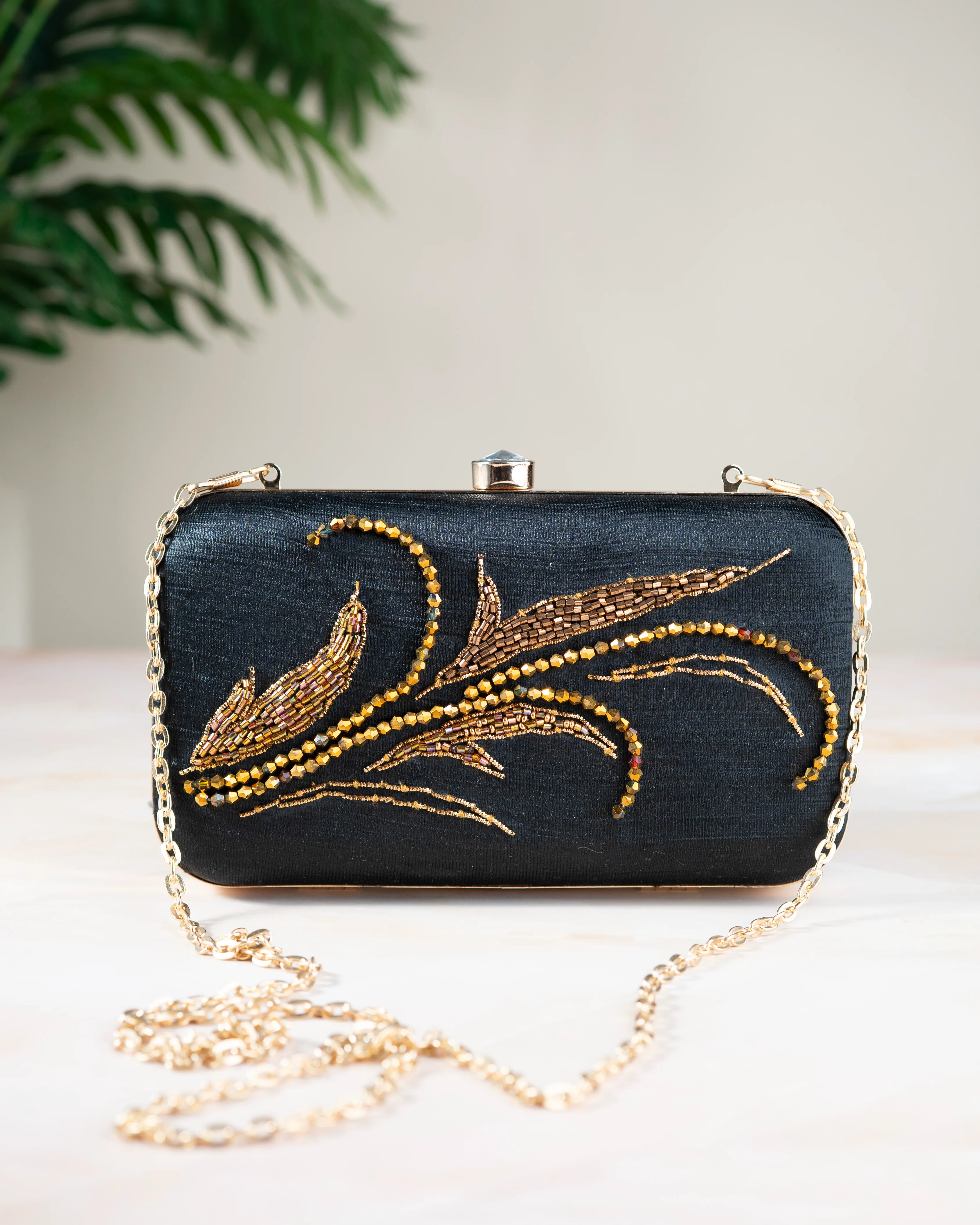 Black Rectangular Box Clutch with Gold Bead Hand Embroidery