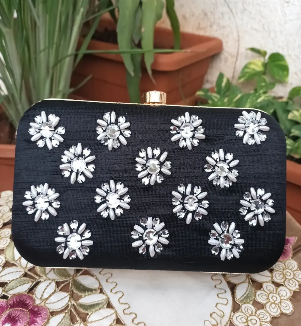 Black Rectangular Box Clutch with Pearl andRhinestone Embroidery