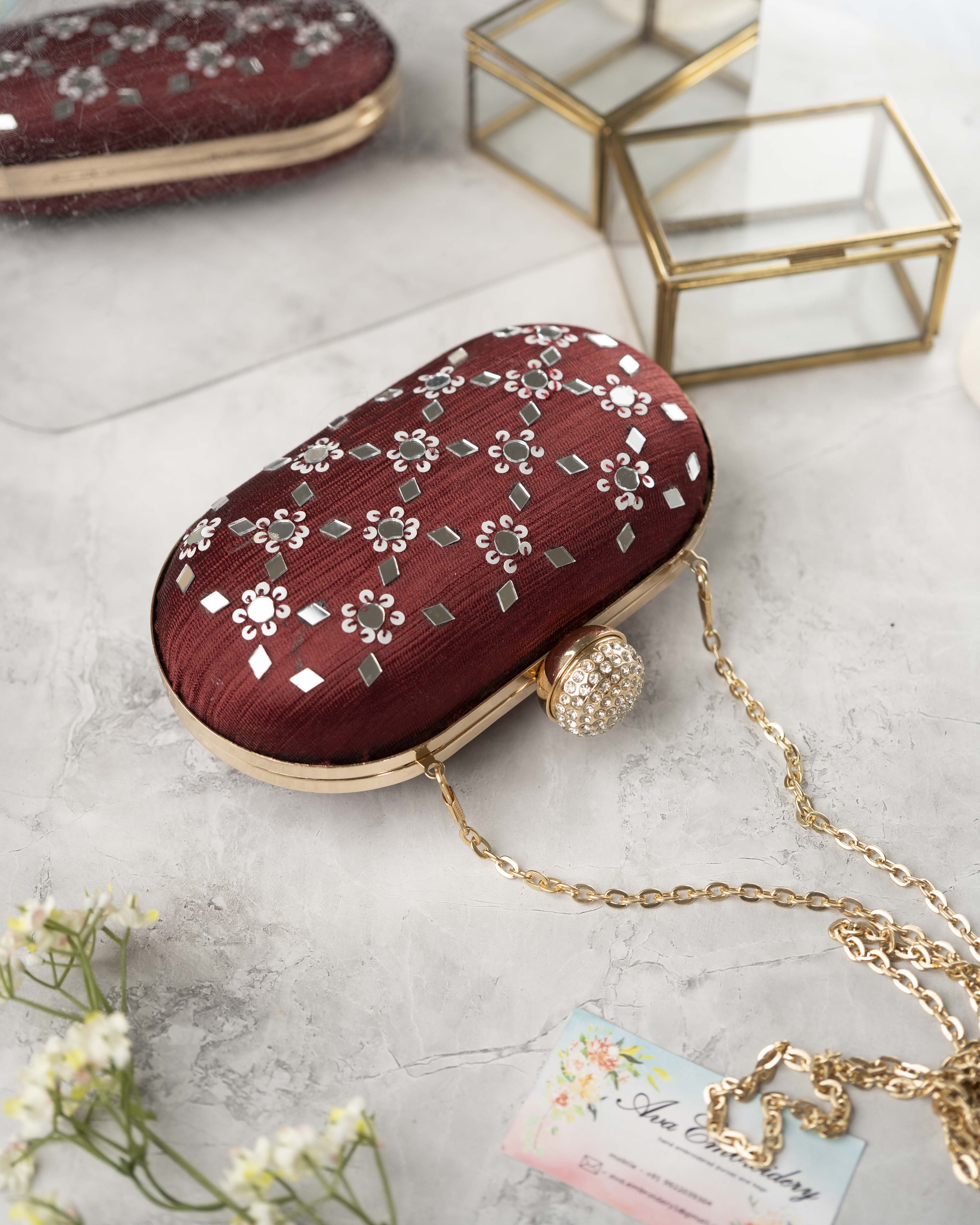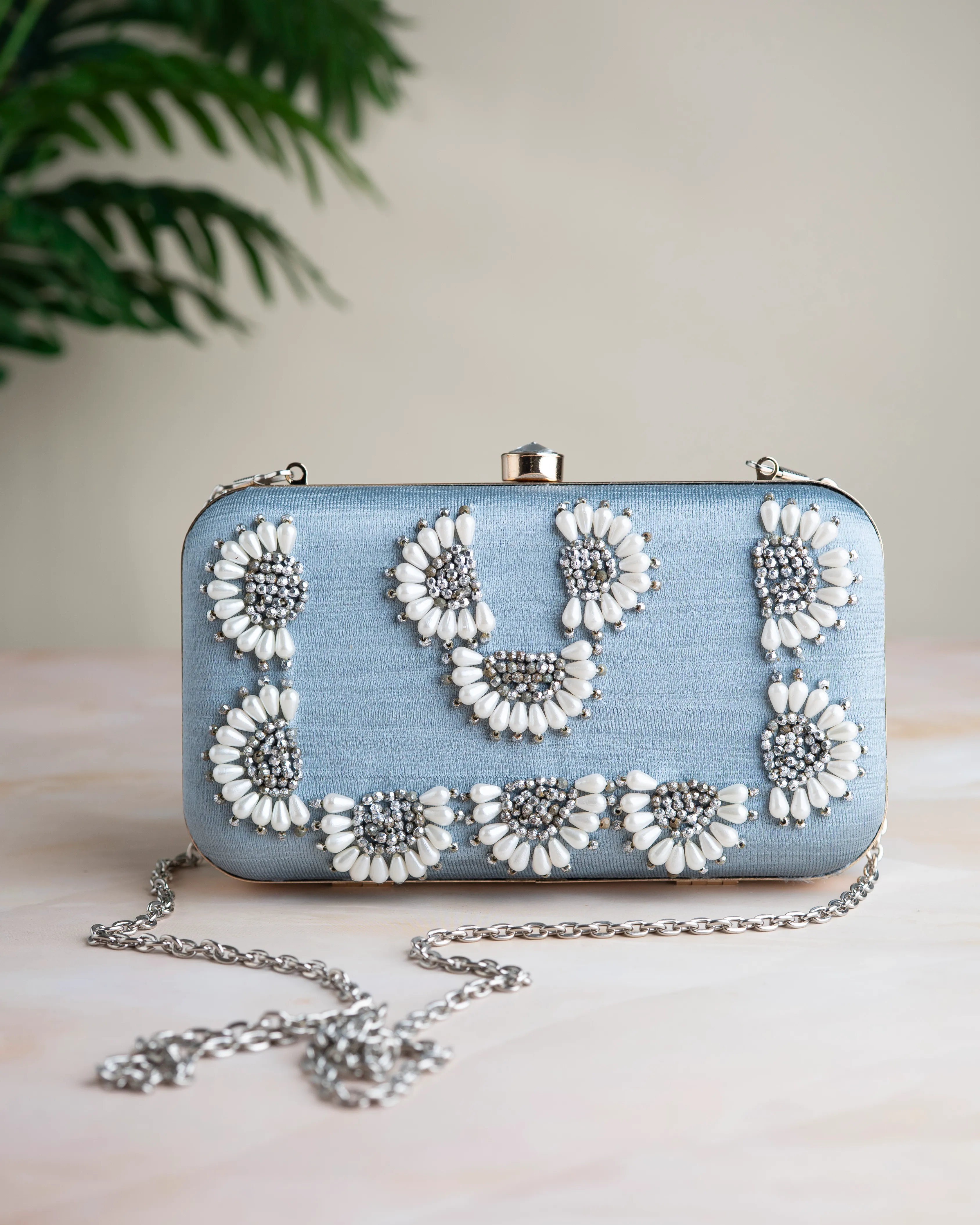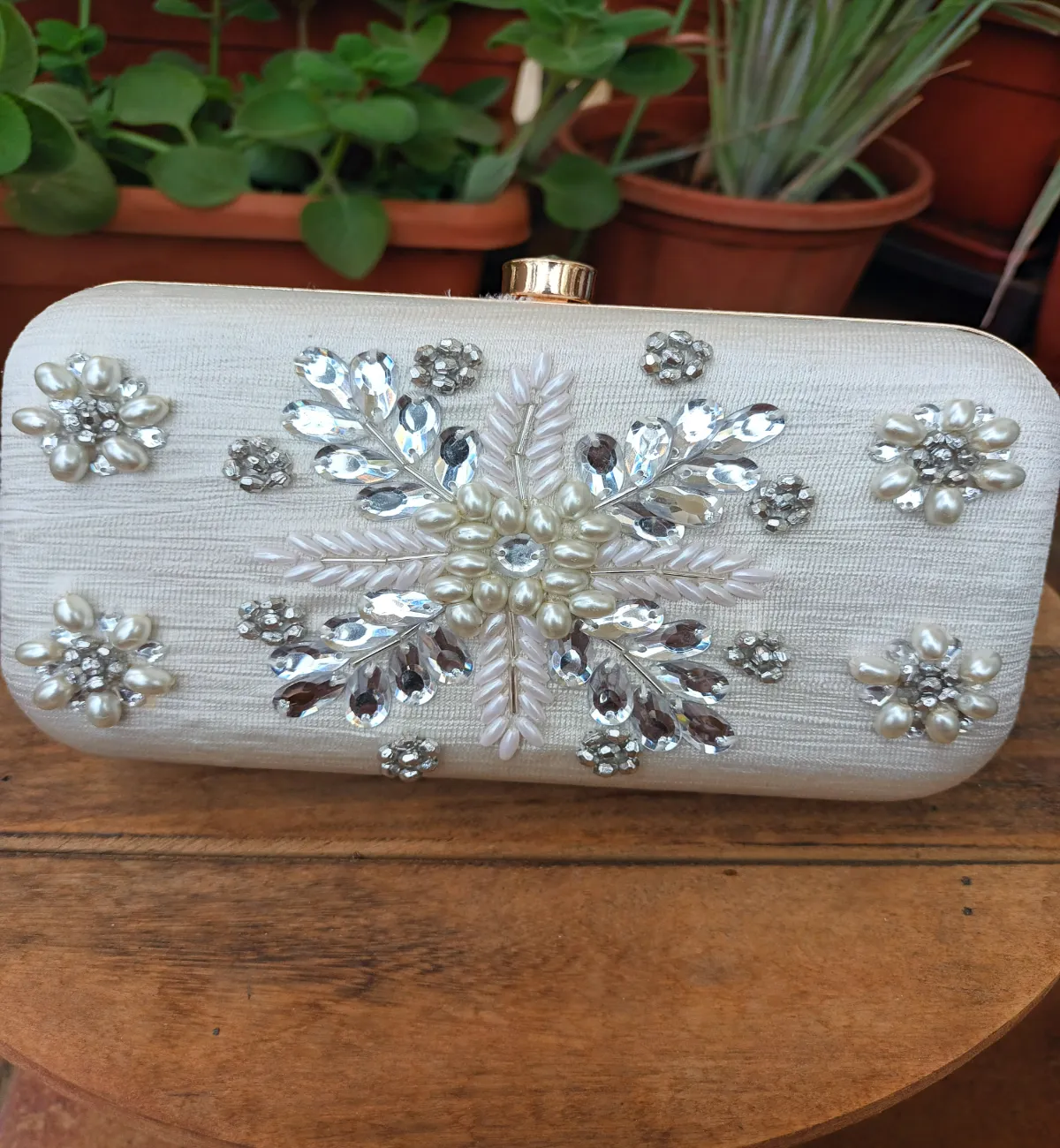 Rectangular Box Clutch with Pearl and Rhinestone Embroidery