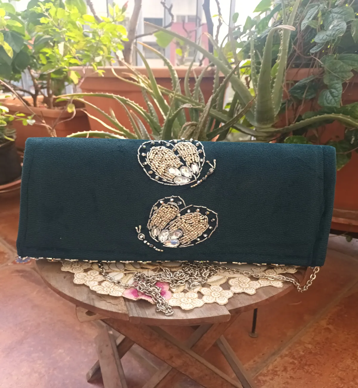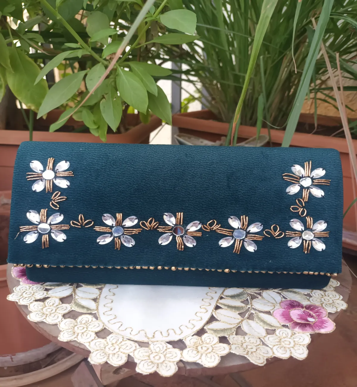 Dark Green Flap Clutch with Zari and Rhinestone Embroidery