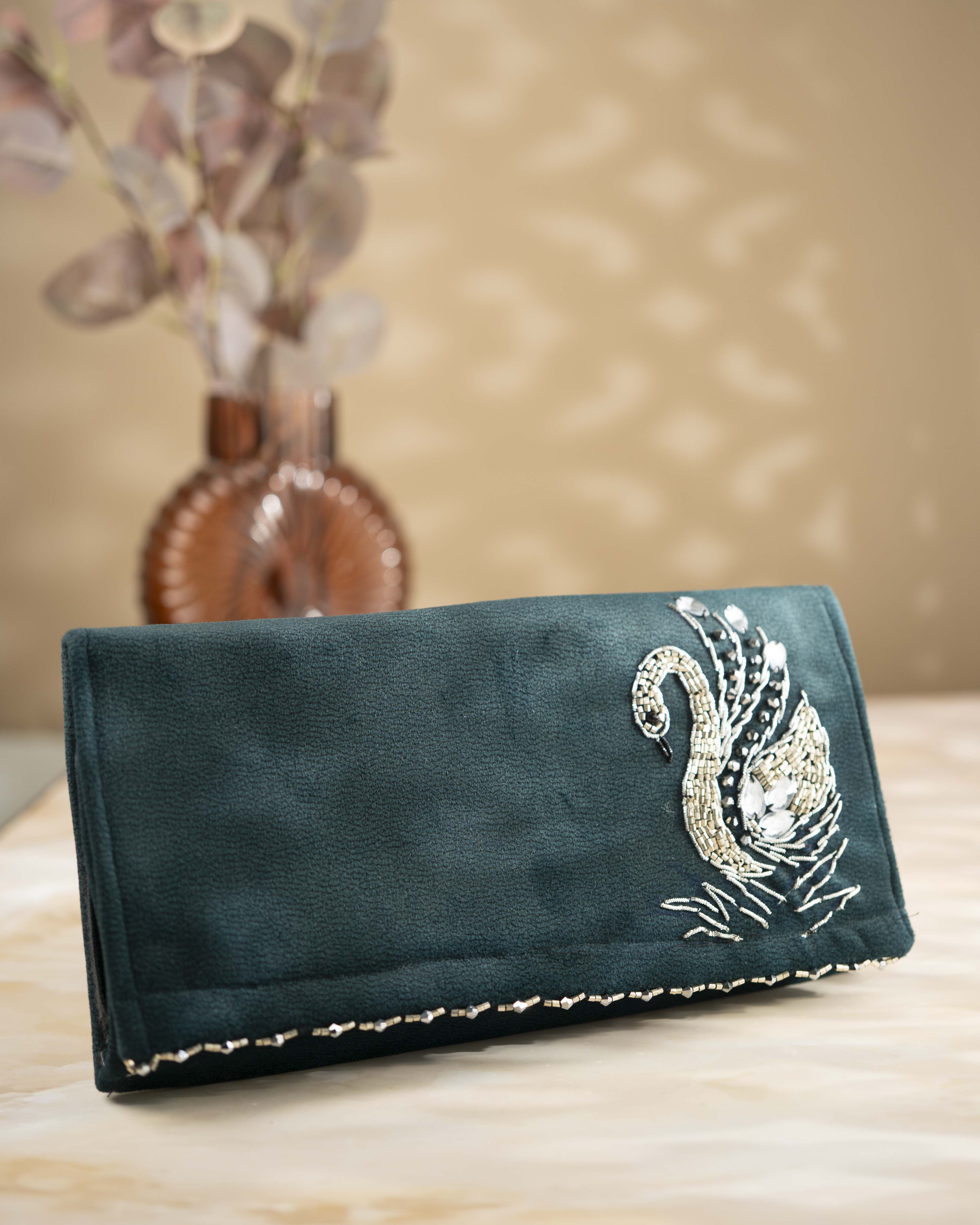 Dark Green Flap Clutch with Silver Swan Embroidery