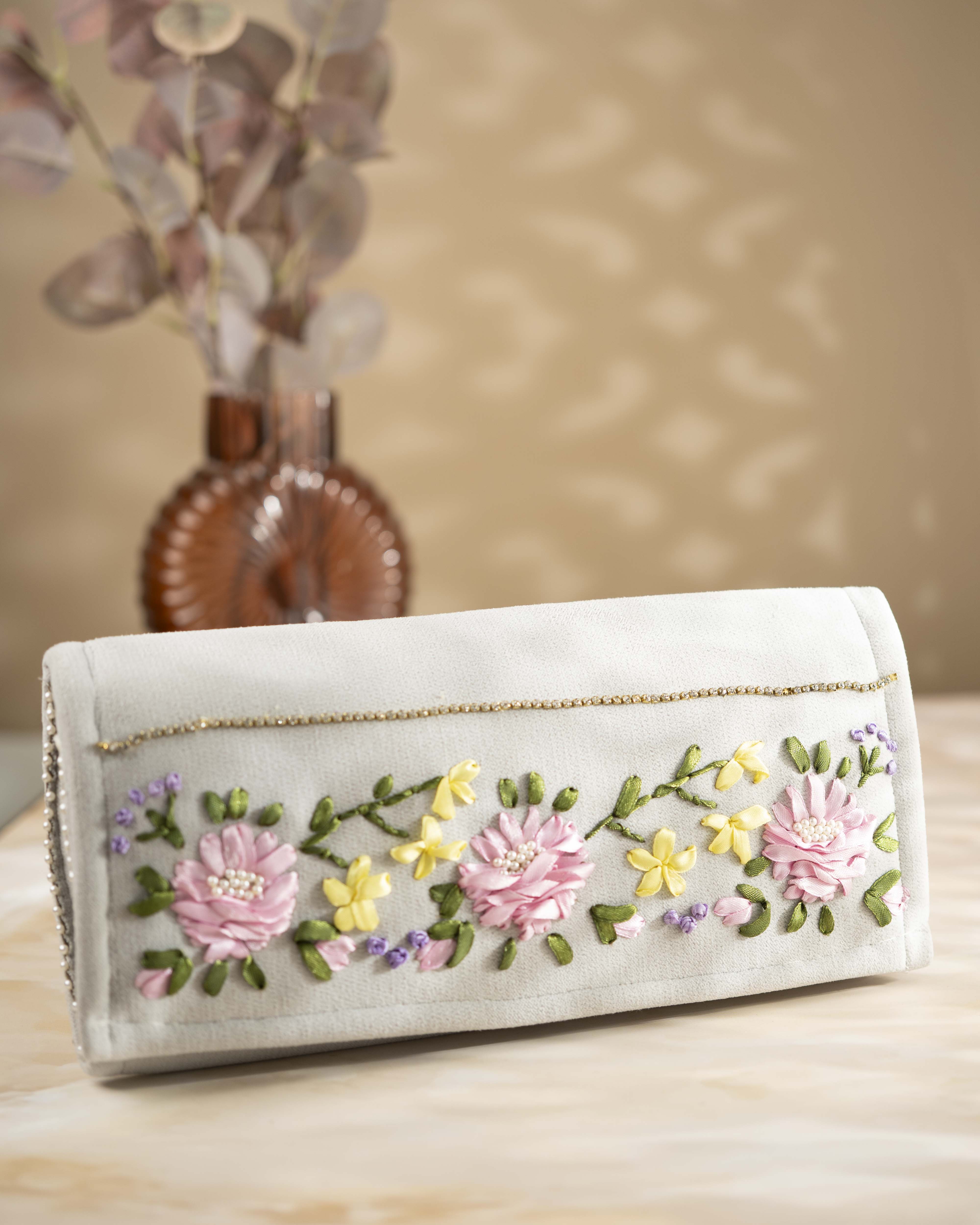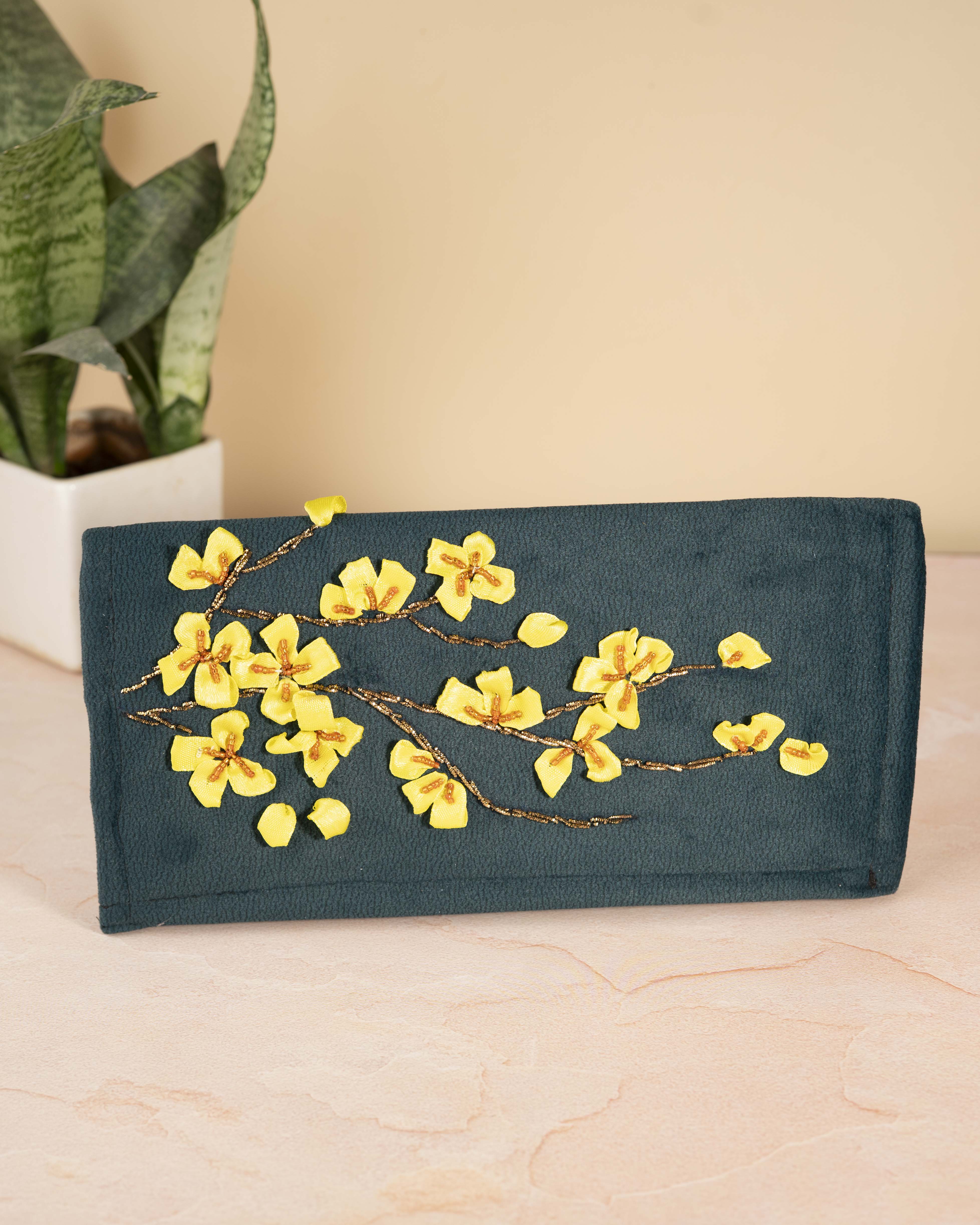 Dark Green Clutch with Bright Yellow Flower Embroidery
