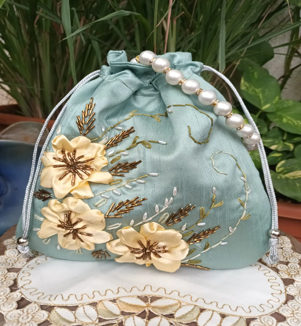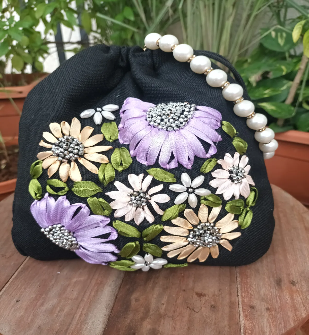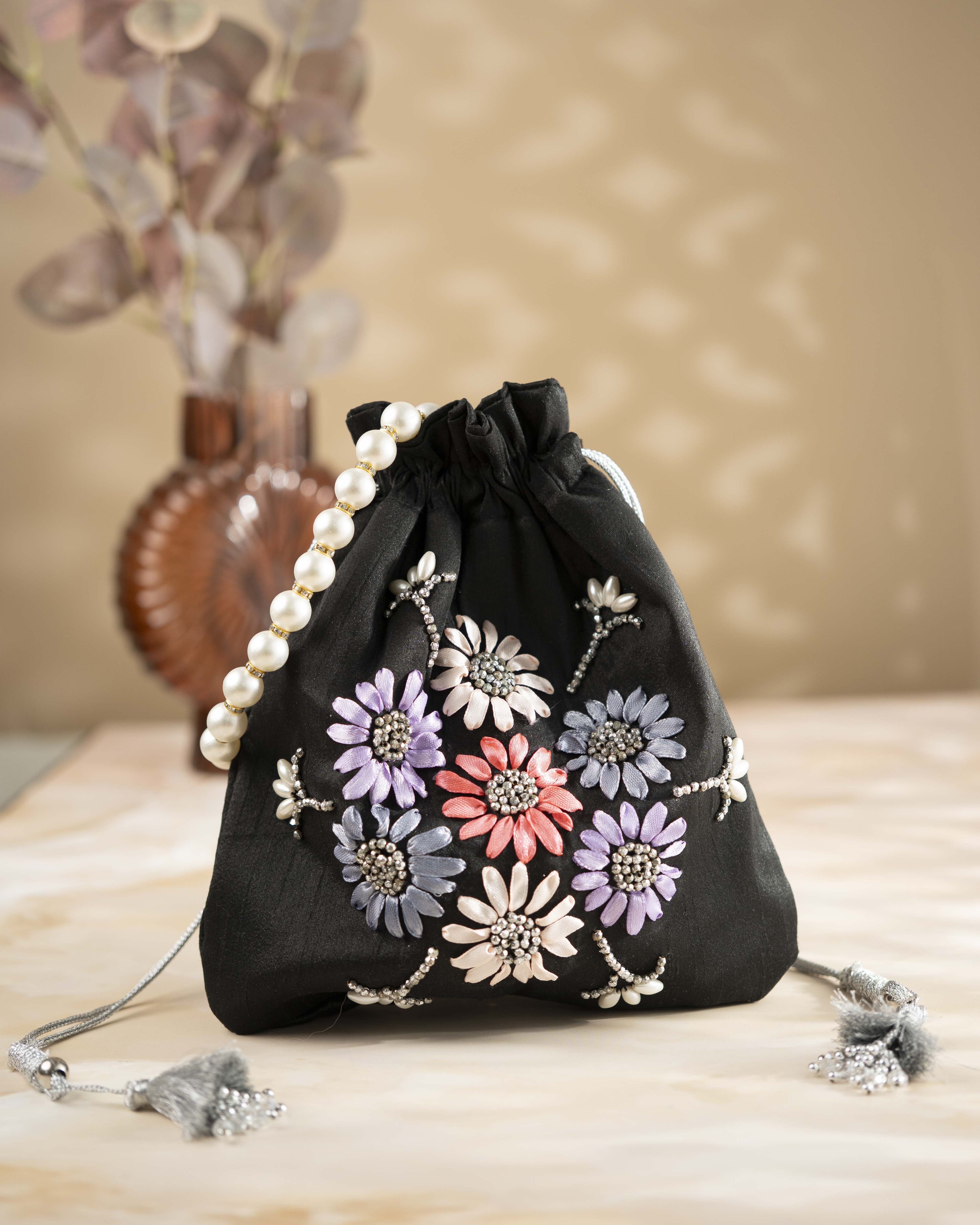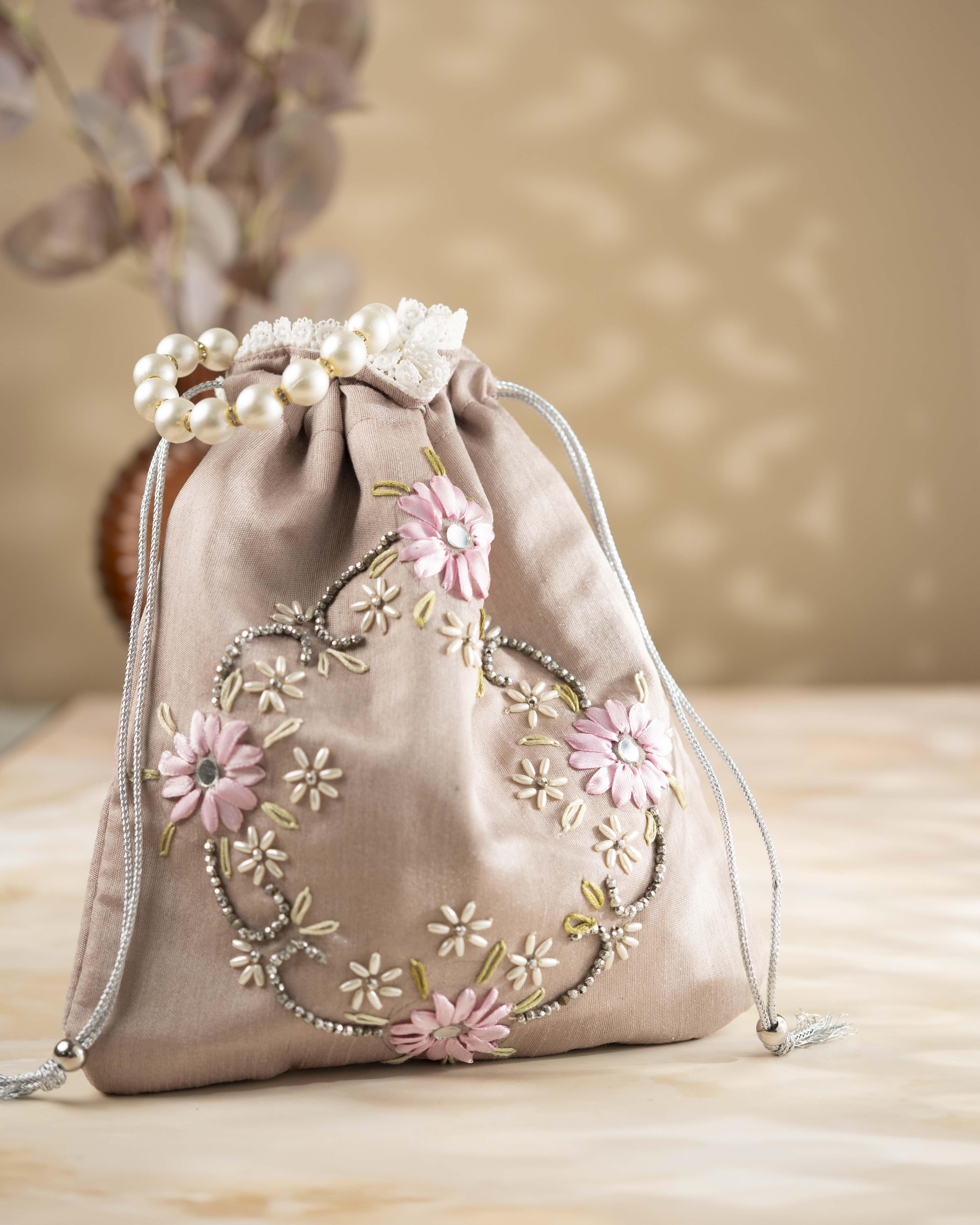 Potli Purse with Hand Embroidered Ribbon Flowers