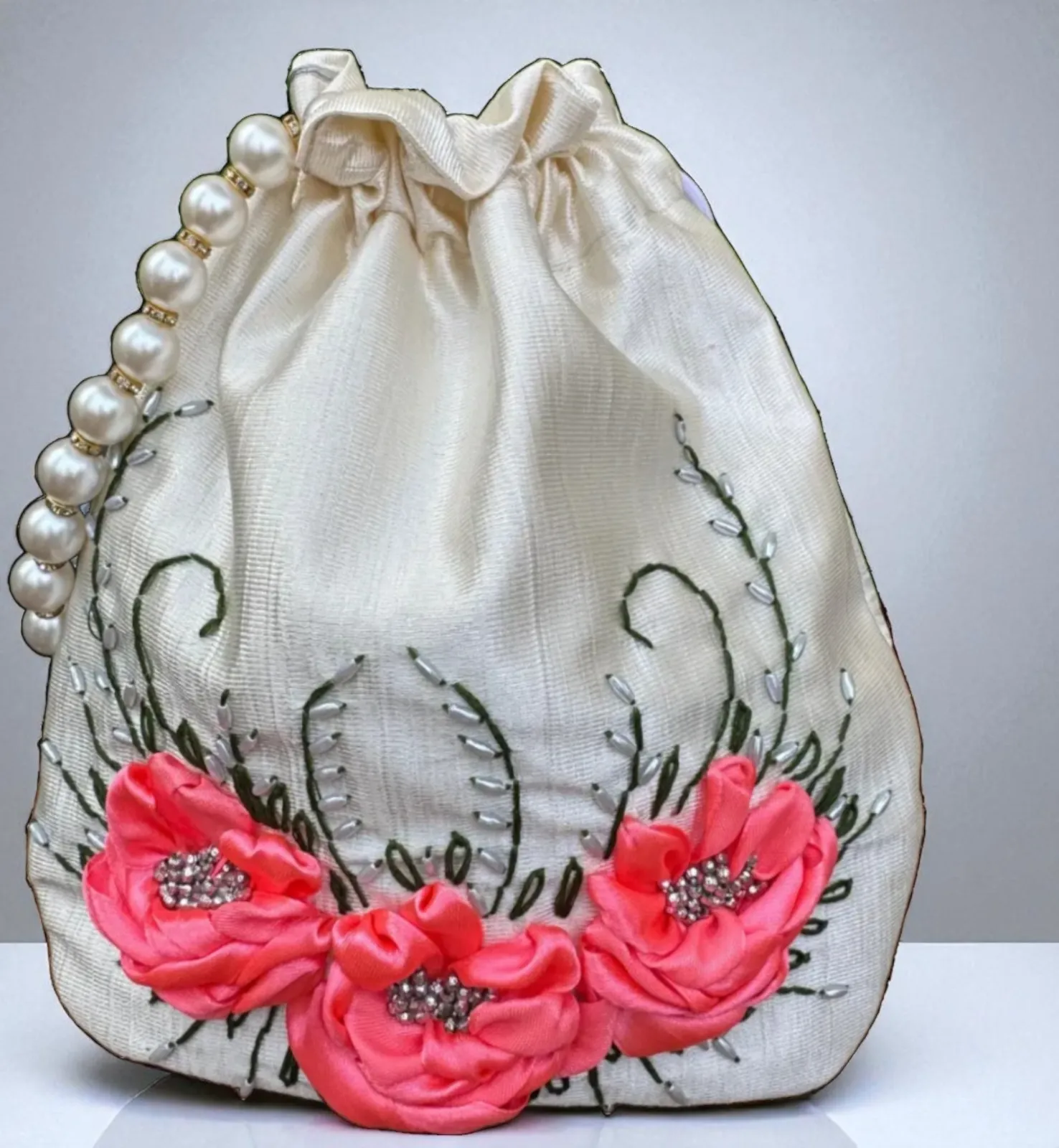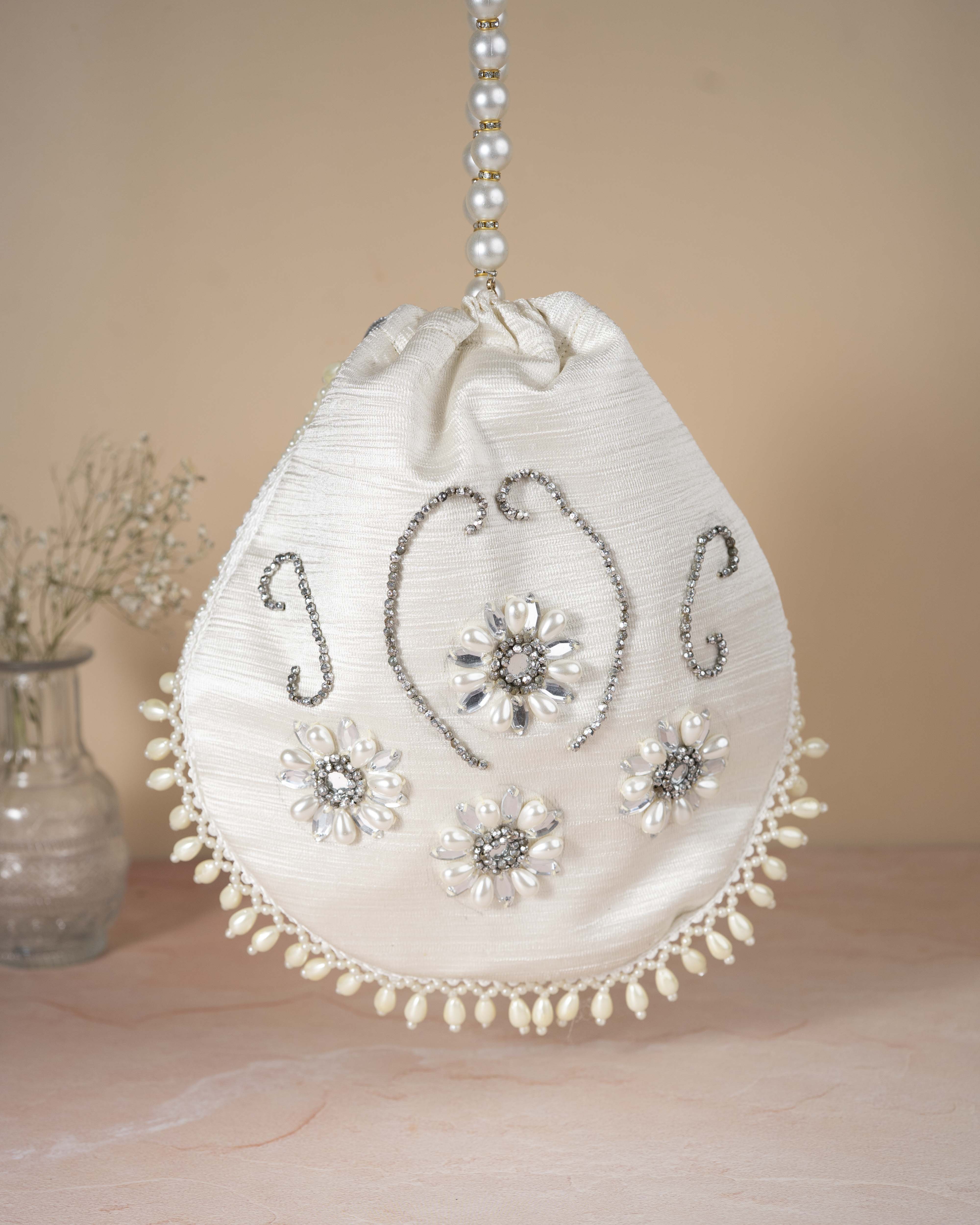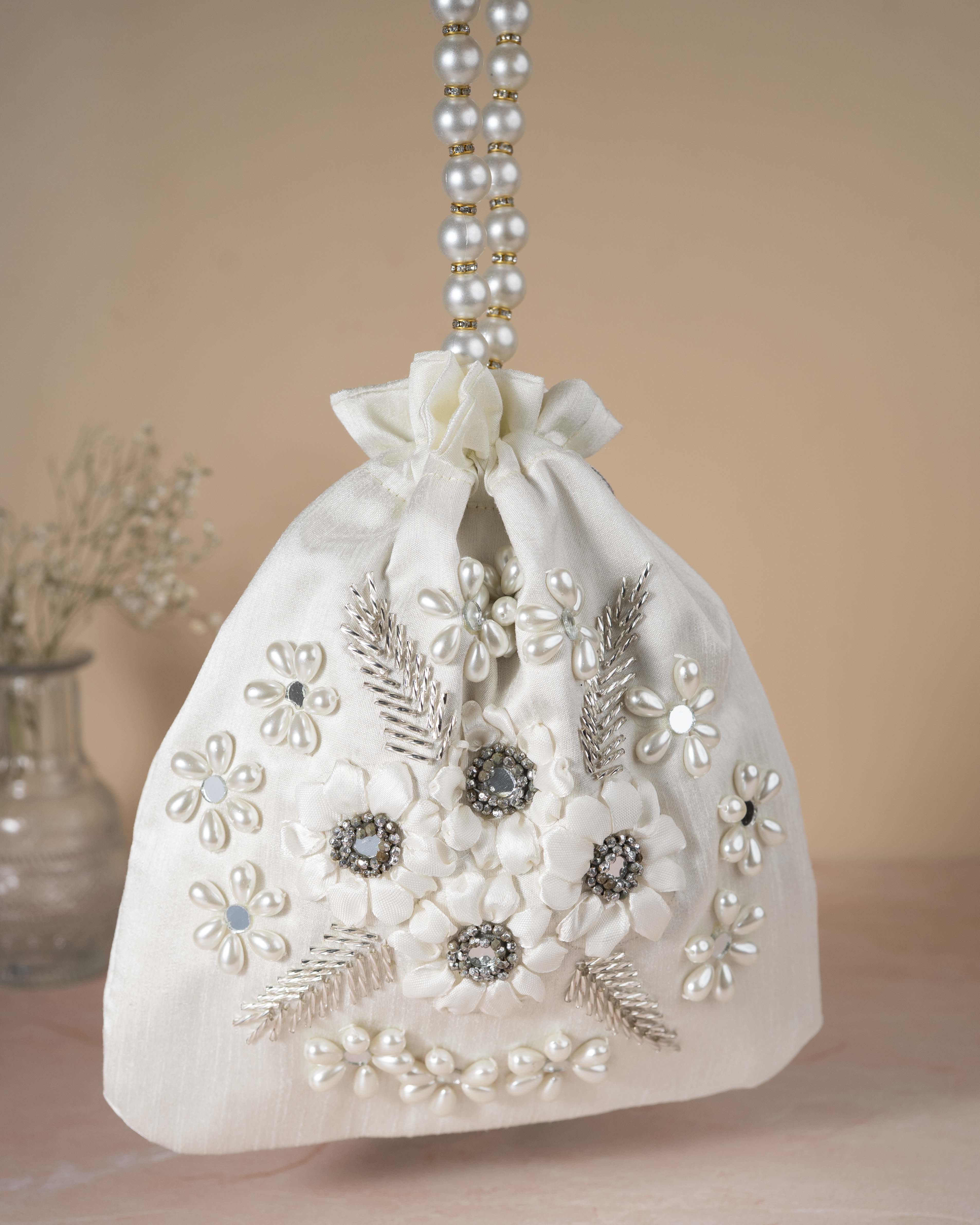 White Potli Purse with Hand Embroidered Ribbon Flowers