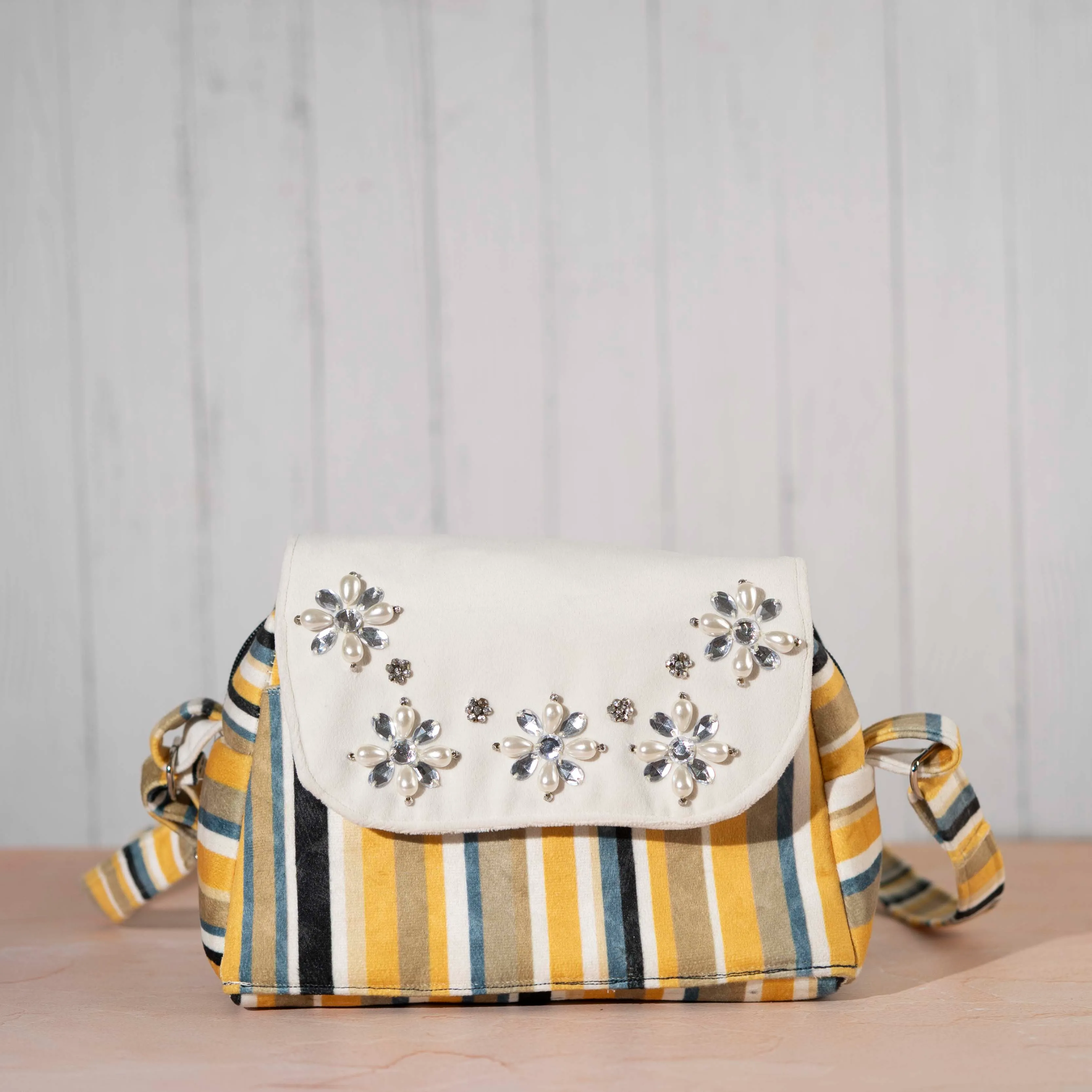 Striped rectangular flap purse with bead embroidery